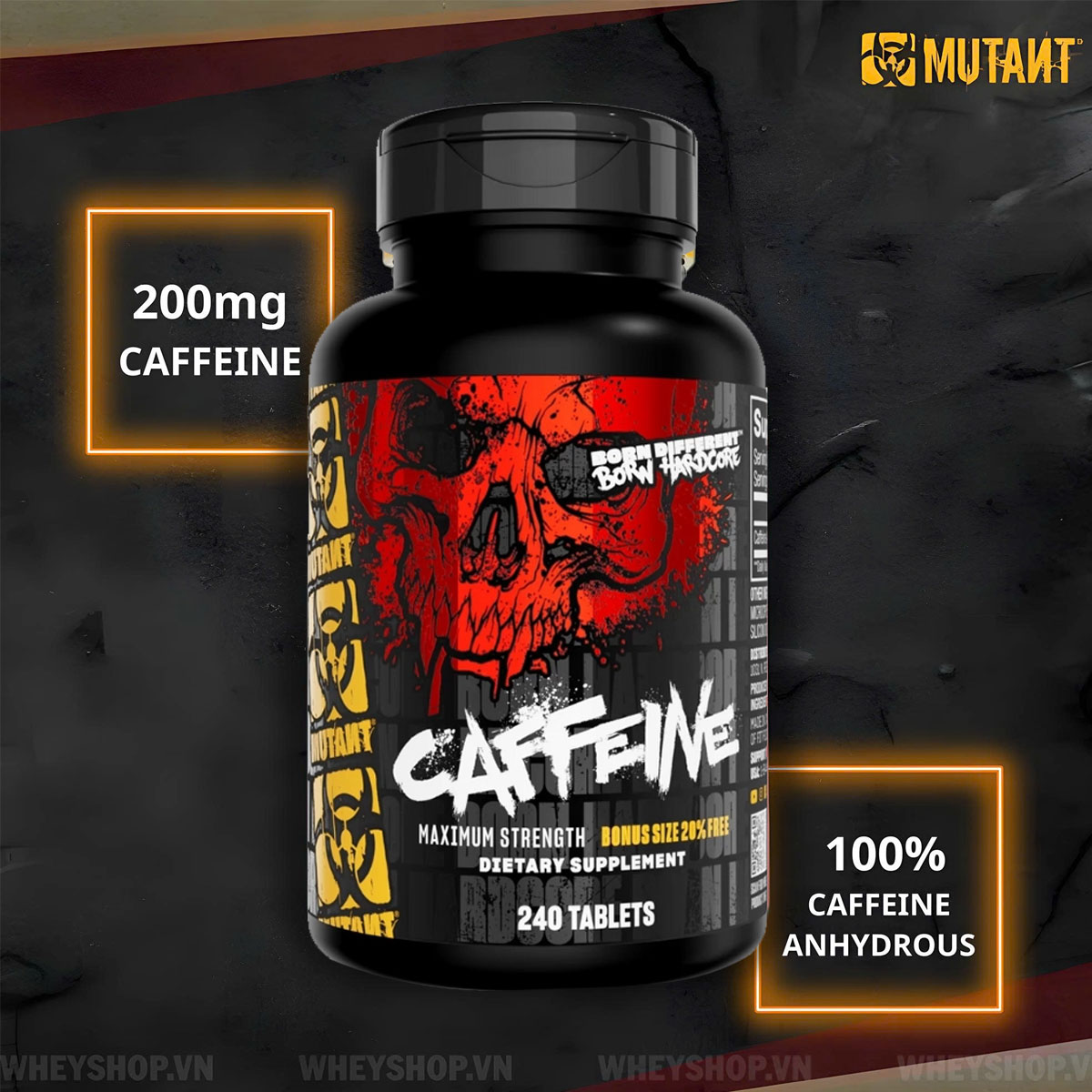 THÀNH PHẦN CHÍNH Hàm lượng: 200 mg Caffeine Số lần dùng (serving size): 240 viên Thành phần chính: 100% Caffeine Anhydrous Xuất xứ : Canada Thương hiệu : Mutant |