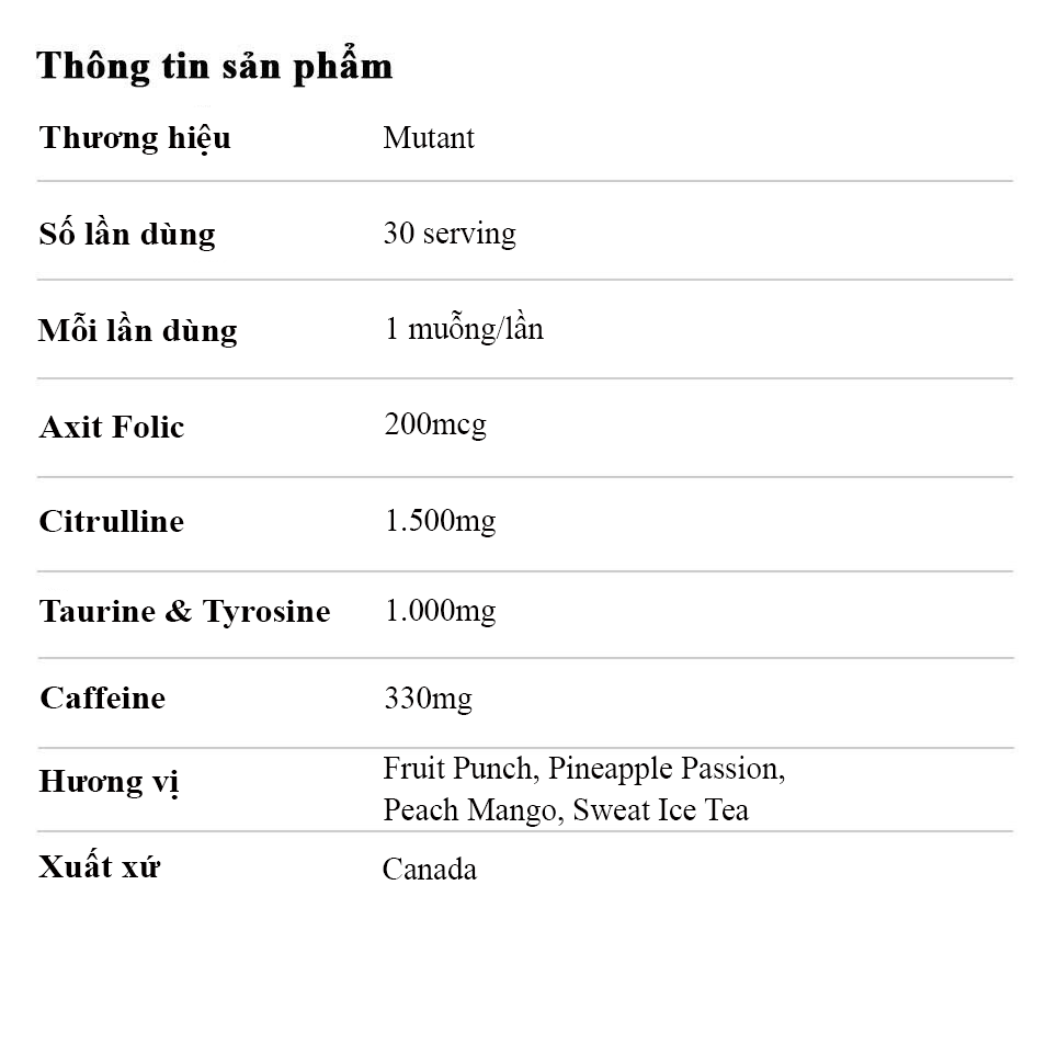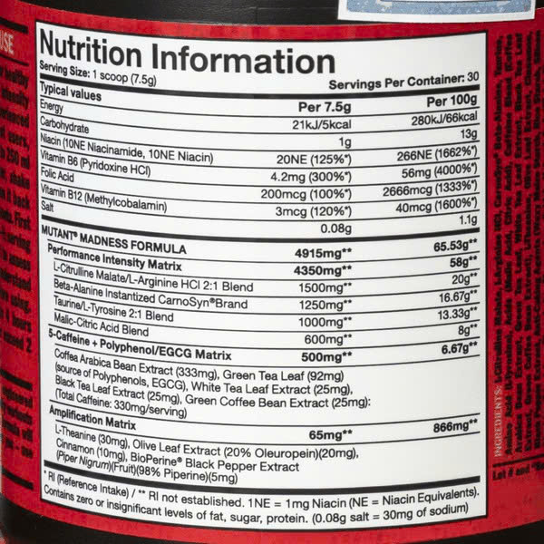 Mutant MADNESS là sản phẩm tăng sức mạnh của Mutant - hãng thực phẩm bổ sung danh tiếng hàng đầu hiện nay. Mutant Madness hỗ trợ tăng cường sức mạnh, sức bền, cải thiện hiệu suất tập luyện hiệu quả hàng đầu. Mutant Madness sử dụng thành phần chất lượng cao kết hợp Citrulline, Argininr, Beta Alanine, Taurine... đem tới nhiều lợi ích! Sản phẩm phù hợp với đối tượng tập luyện thể thao, gymer, vận động viên cần tăng sức mạnh trong những buổi tập luyện và cải thiện hiệu suất thể thao một cách đột phá. THÀNH PHẦN CHÍNH