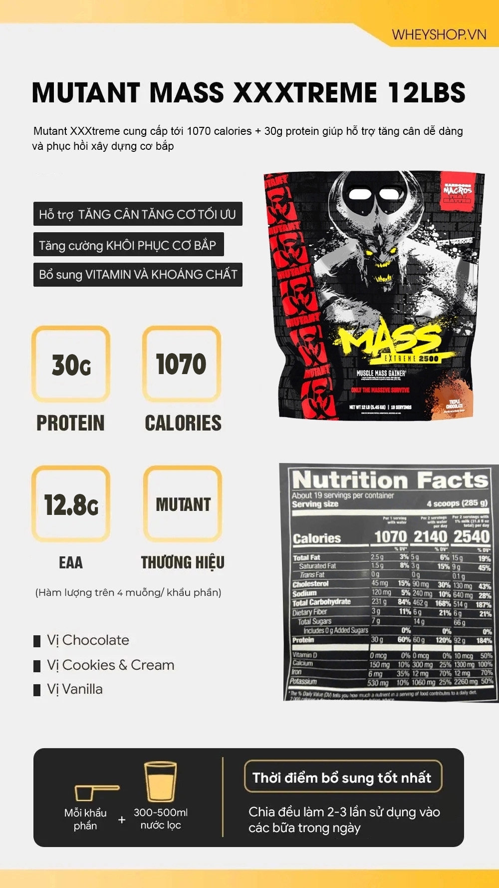 Mutant Mass XXXtreme là sản phẩm Mass Gainer được thiết kế để hỗ trợ tăng cân cho người gầy và chứa tới 2540 calo mỗi khẩu phần, bổ sung đa dạng protein lên đến 92g cho mỗi khẩu phần, amino acid,.. hỗ trợ tăng cân tăng cơ vượt trội. Ngoài ra, Mutant Mass XXXtreme còn bổ sung axit béo giúp tăng cân theo cách lành mạnh, không làm chuyển đổi chất béo xấu thành mỡ thừa trong cơ thể. Mutant Mass XXXtreme nay đã có kích cỡ size vừa 12Lbs ~ 5.4kg dành cho người dùng trải nghiệm sản phẩm hiệu quả. THÀNH PHẦN CHÍNHTrọng lượng: 12Lbs ~ 5.4kg Hàm lượng (hàm lượng tính trên 4 muỗng/khẩu phần)