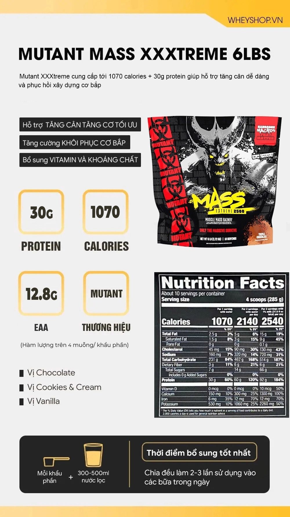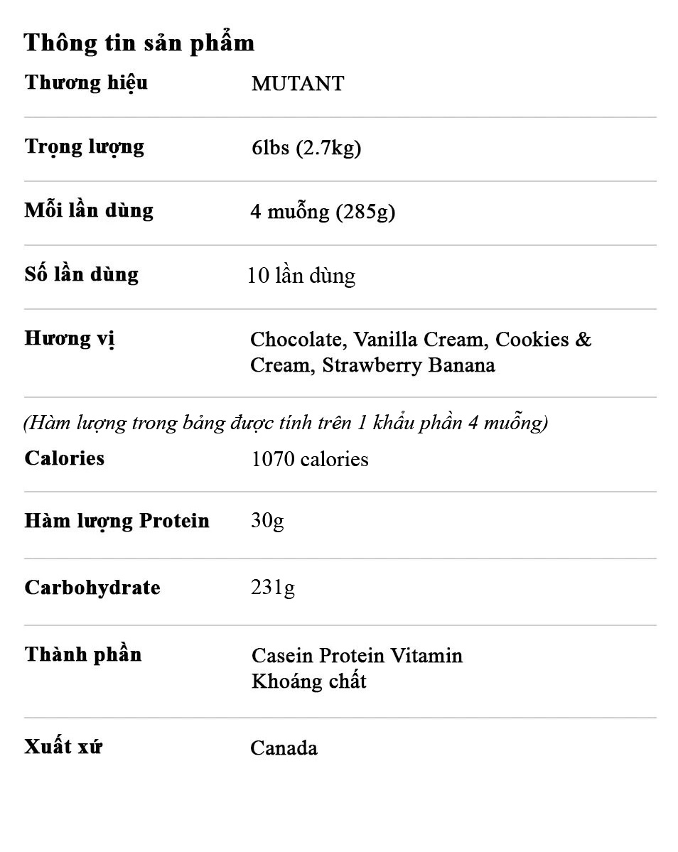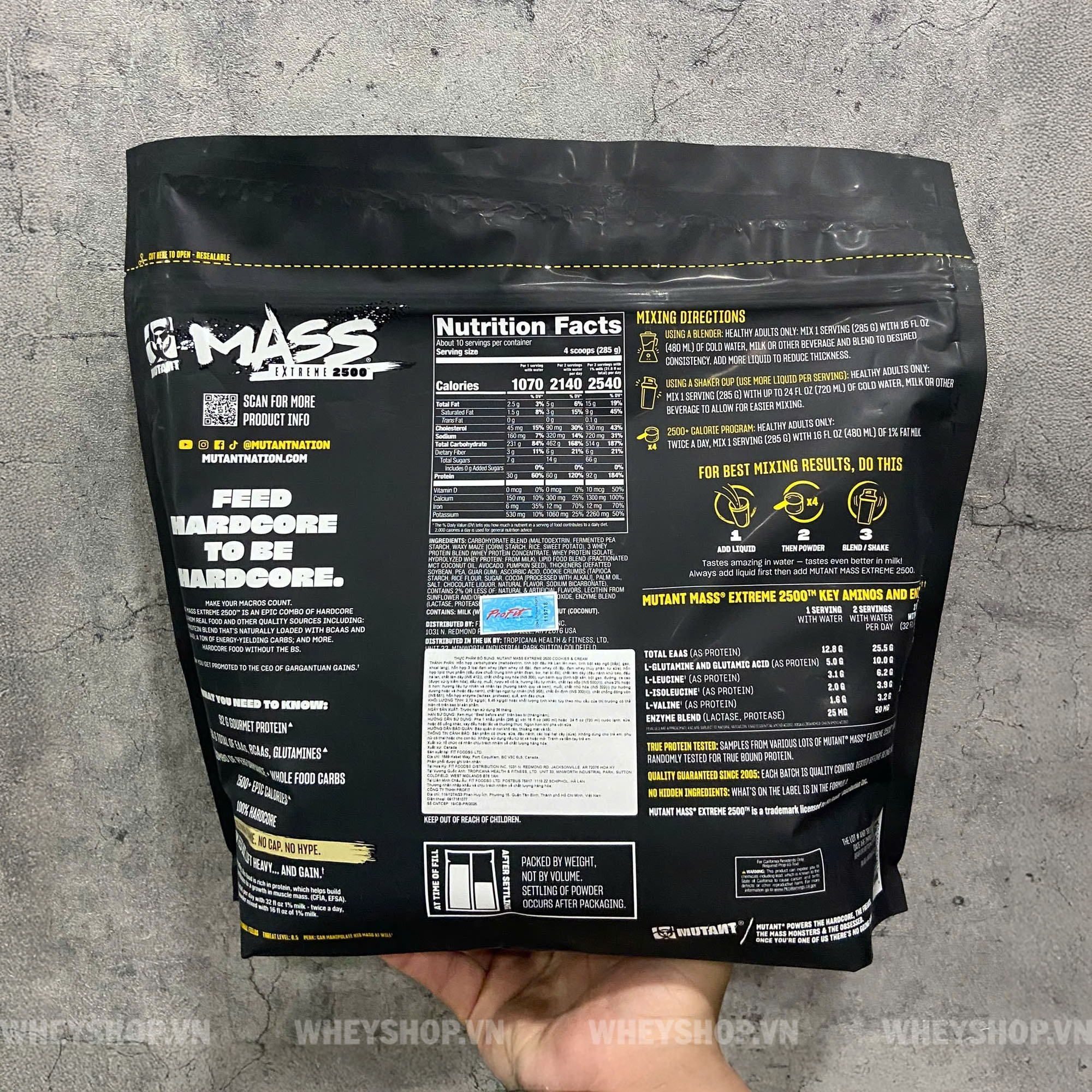 Mutant Mass XXXtreme là sự lựa chọn tốt nhất dành cho người gầy, suy dinh dưỡng. Sản phẩm Mass Gainer này hỗ trợ quá trình trao đổi chất diễn ra nhanh chóng, từ đó cải thiện cân nặng của bản thân. Với lượng calo cao trong mỗi khẩu phần, Mutant Mass XXXtreme được đánh giá cực kỳ hiệu quả đối với người trong tình trạng thiếu cân. Mua sữa tăng cân Mutant Mass XXXtreme giá tốt, chất lượng cao, tránh hàng giả, hãy tham khảo WheyShop - nơi chuyên cung cấp sản phẩm Mutant được nhập khẩu chính hãng. THÀNH PHẦN CHÍNHTrọng lượng: 6Lbs ~ 2.7kg Hàm lượng (hàm lượng trên 4 muỗng/ khẩu phần)