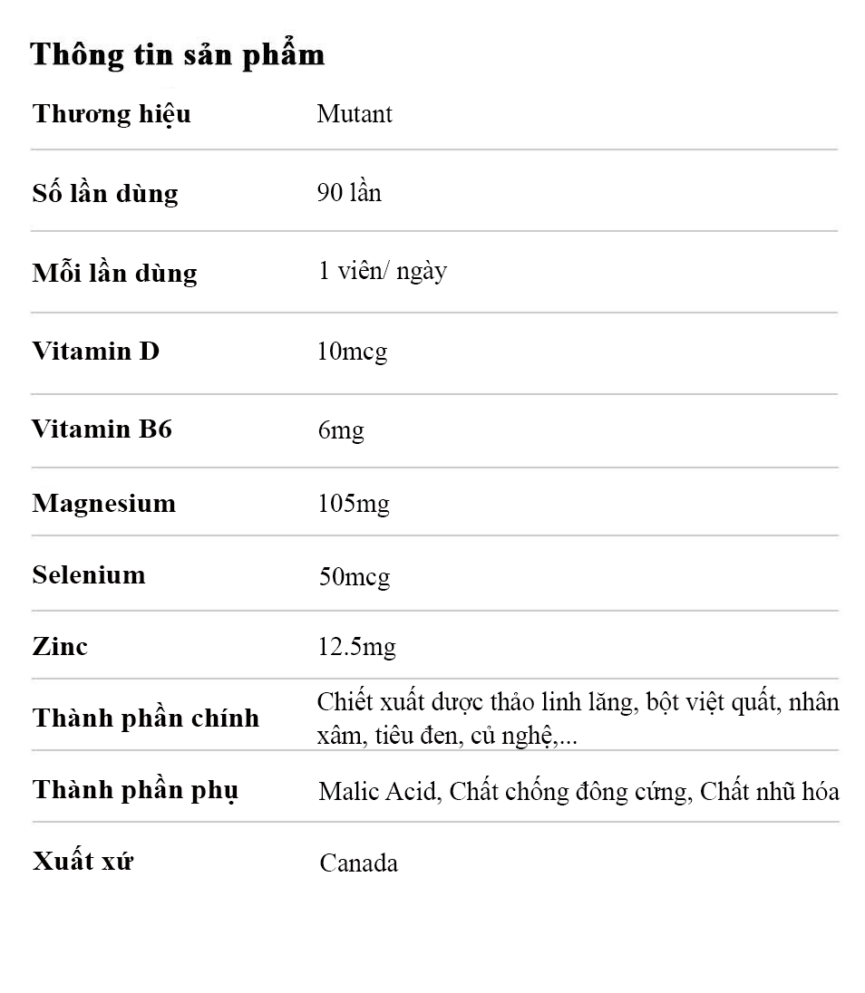 Thành phần chính: Chiết xuất dược thảo linh lăng, bột việt quất, nhân xâm, tiêu đen, củ nghệ,... Thành phần phụ: Malic Acid, Chất chống đông cứng, Chất nhũ hóa Thương hiệu: Mutant Xuất xứ: Canada |