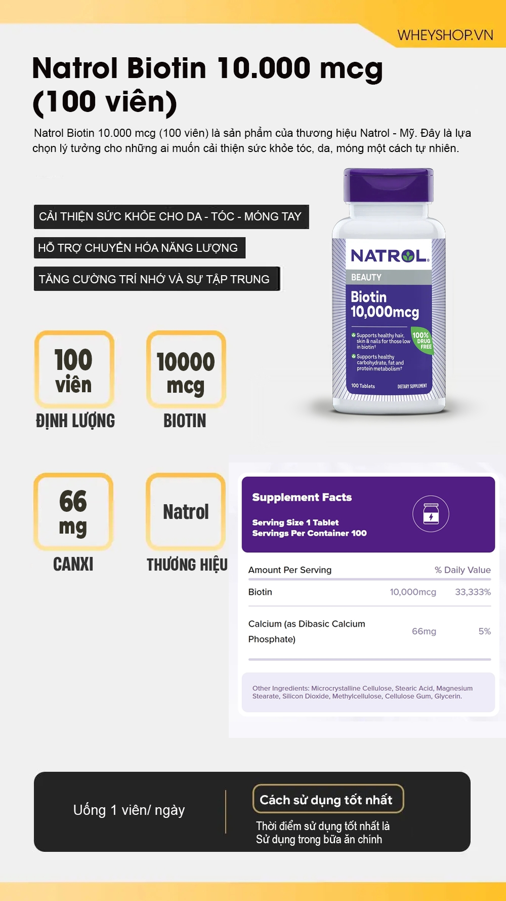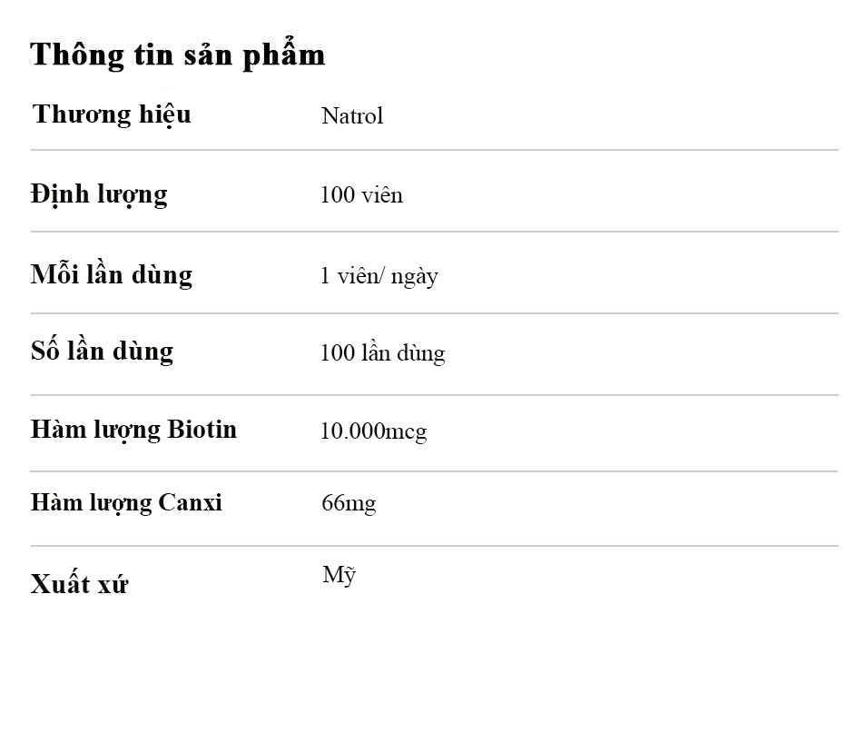 Natrol Biotin 10.000 mcg là thực phẩm bổ sung giúp nuôi dưỡng tóc chắc khỏe, giảm gãy rụng và kích thích mọc tóc hiệu quả. Biotin còn hỗ trợ duy trì làn da mịn màng, giảm khô sần và giúp móng tay chắc khỏe hơn. Với hàm lượng 10.000 mcg mỗi viên, sản phẩm cung cấp đủ dưỡng chất cần thiết cho cơ thể, thúc đẩy quá trình chuyển hóa năng lượng từ thực phẩm, giúp bạn luôn tràn đầy sức sống. Đây là lựa chọn lý tưởng cho những ai muốn cải thiện sức khỏe tóc, da, móng một cách tự nhiên. Natrol Biotin 10.000mcg có nguồn gốc từ Mỹ, đảm bảo các tiêu chí: