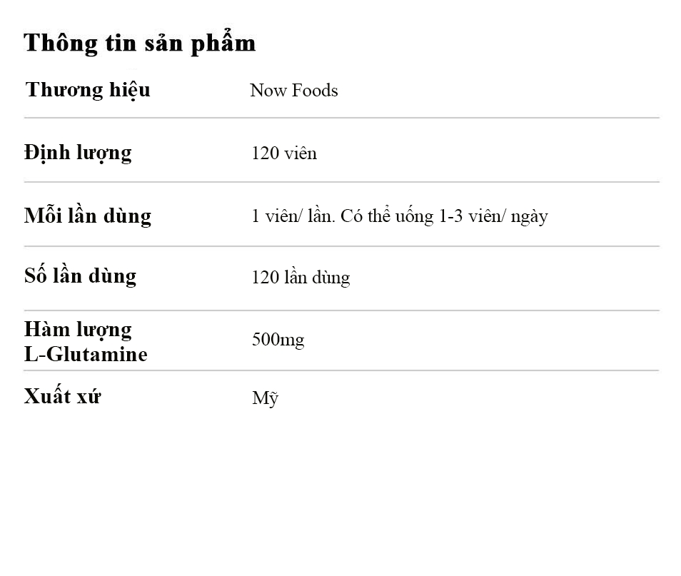 Định lượng: 120 viên Mỗi lần dùng: 1 viên/ lần. Có thể uống 1-3 viên/ ngày Số lần dùng: 120 lần dùng Hàm lượng L-Glutamine: 500mg Thương hiệu: Now Foods Xuất xứ: Mỹ |