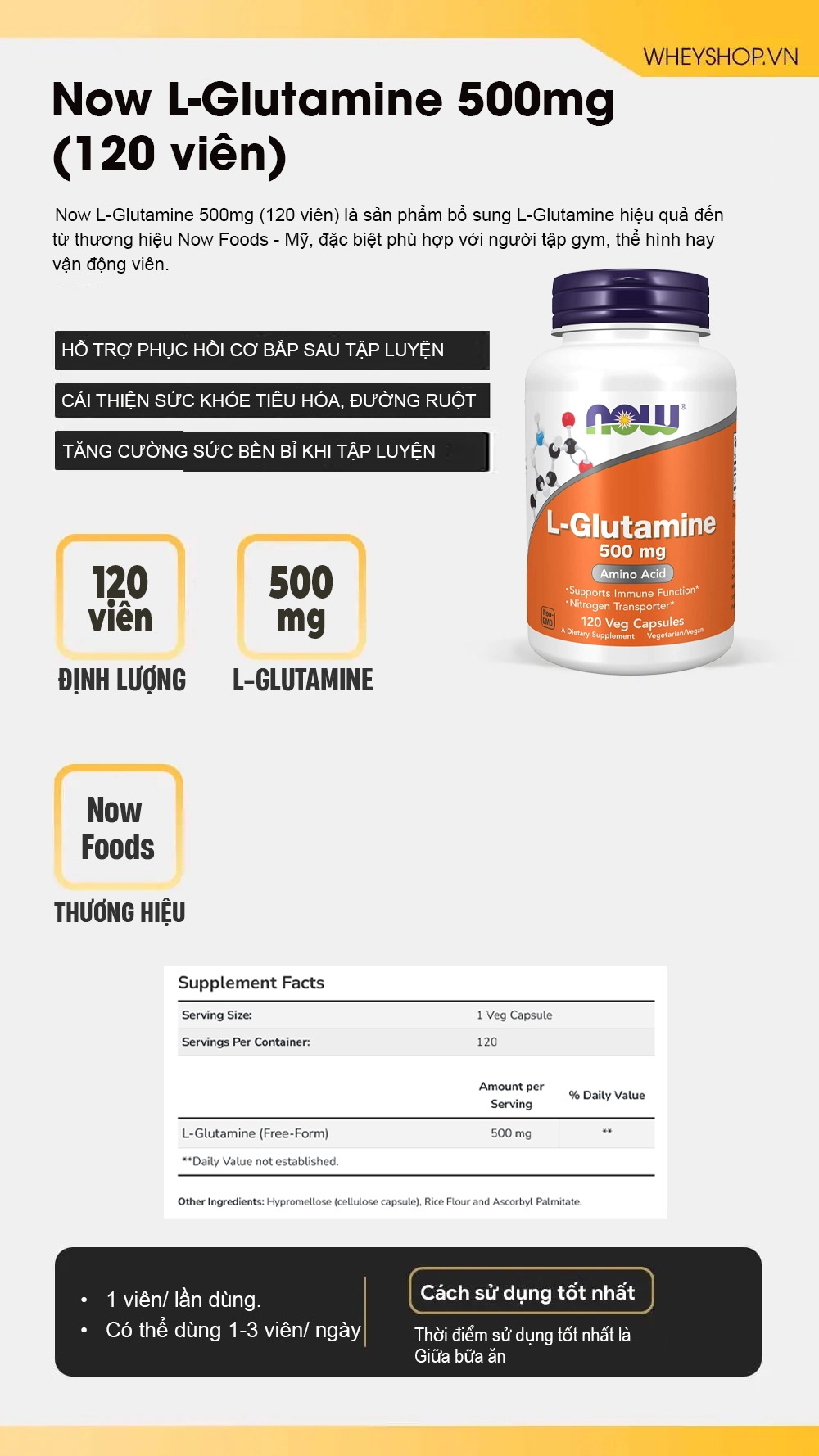WheyShop là hệ thống bán lẻ thực phẩm bổ sung uy tín hàng đầu tại Việt Nam, được nhiều vận động viên và người tiêu dùng tin tưởng lựa chọn. WheyShop cam kết cung cấp sản phẩm Now L-Glutamine 500mg (120 viên) chính hãng, có đầy đủ giấy tờ chứng nhận nguồn gốc và chất lượng. Đội ngũ tư vấn viên chuyên nghiệp, giàu kinh nghiệm, sẵn sàng hỗ trợ khách hàng lựa chọn sản phẩm phù hợp và giải đáp mọi thắc mắc.
