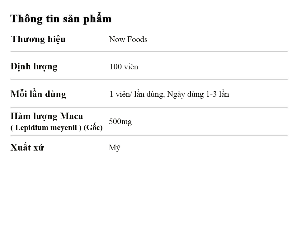THÀNH PHẦN CHÍNH Định lượng: 100 viên Mỗi lần dùng: 1 viên/ lần dùng. Ngày dùng 1-3 lần Số lần dùng: 100 lần dùng Hàm lượng Maca (Lepidium meyenii): 500mg Thương hiệu: Now Foods Xuất xứ: Mỹ |