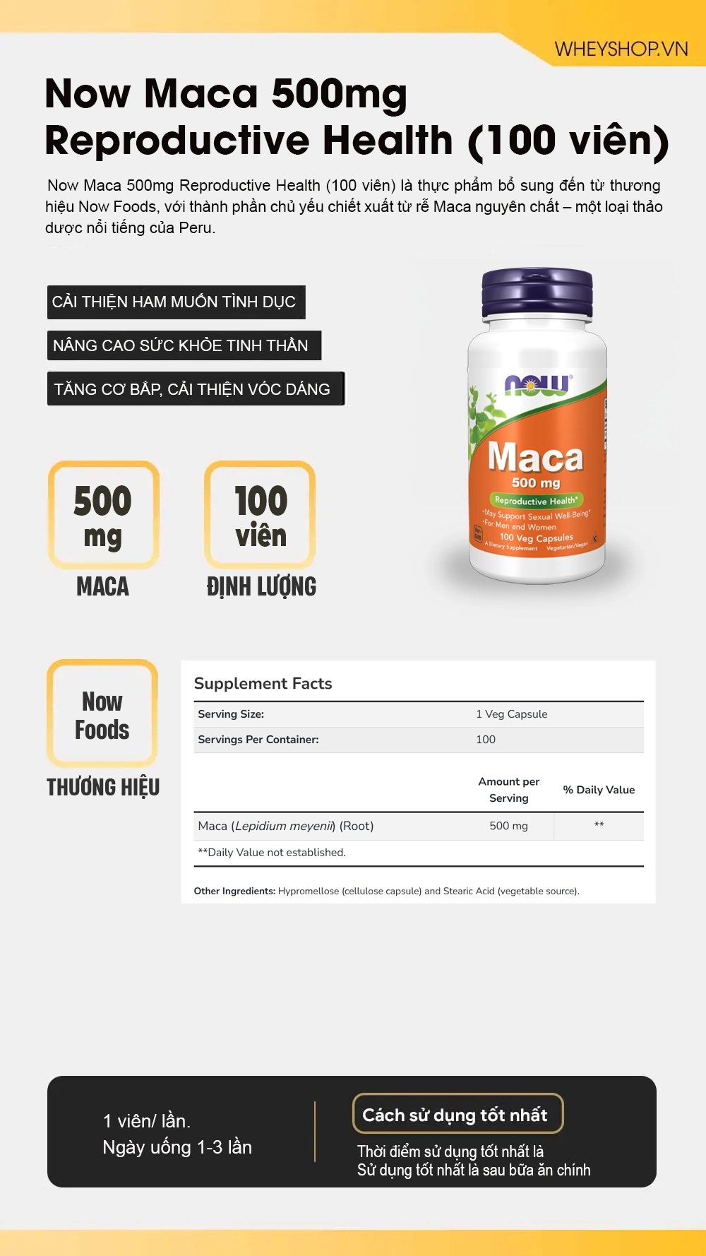 Now Maca 500mg Reproductive Health giúp tăng ham muốn tình dục, cải thiện độ dẻo dai và cân bằng testosterone tự nhiên ở nam giới.