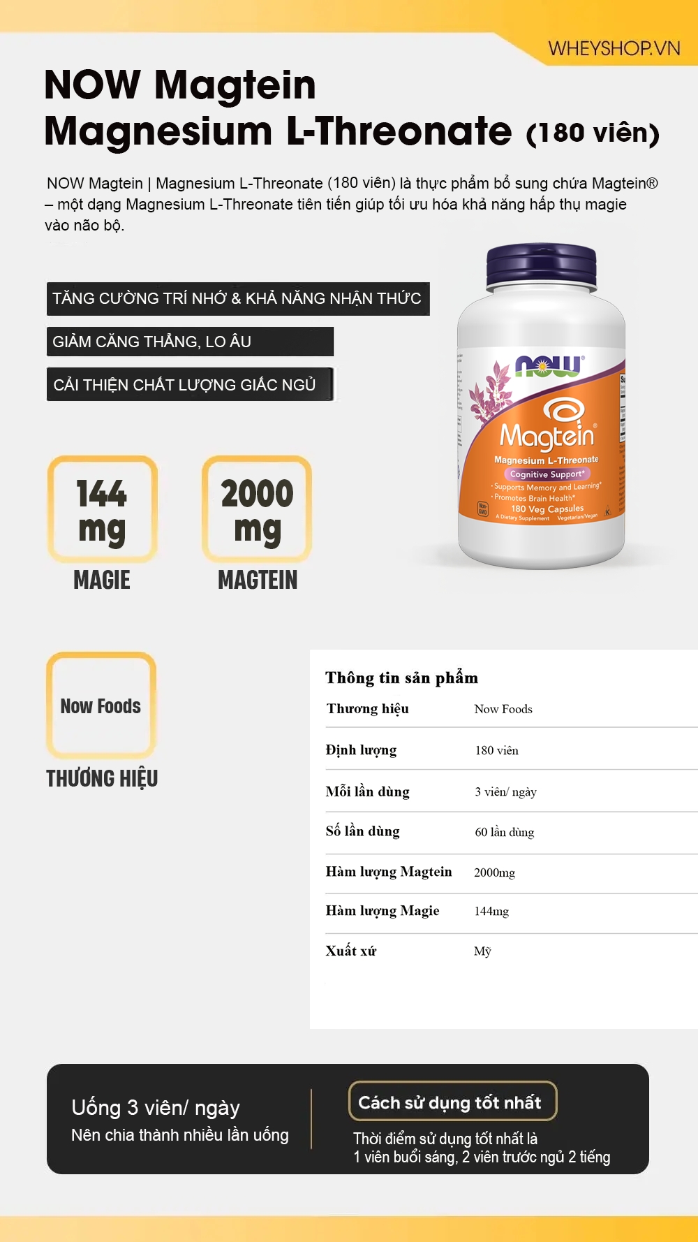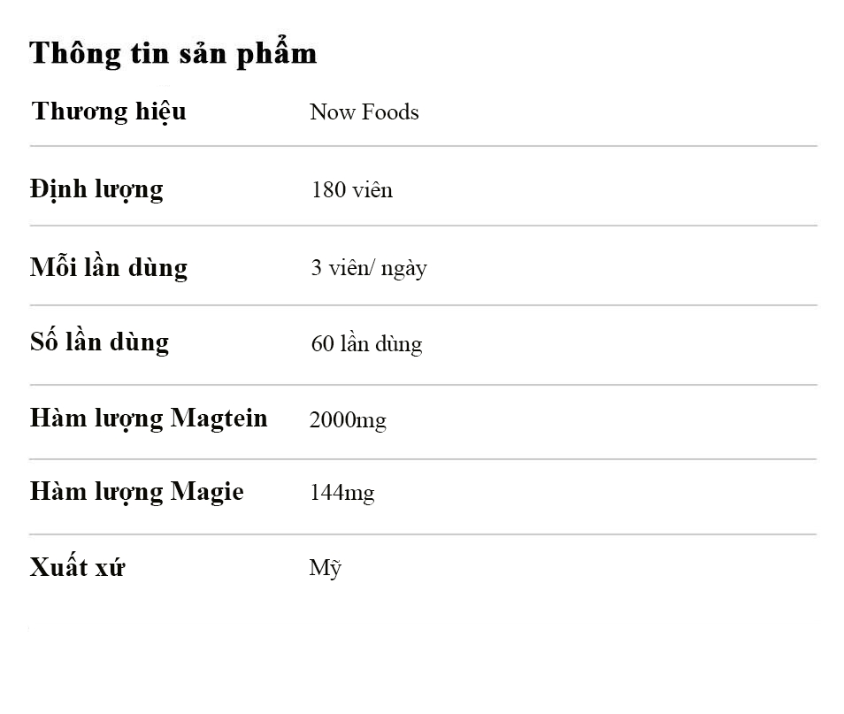 | Thành phần chính | NOW Magtein | Magnesium L-Threonate (180 viên) |