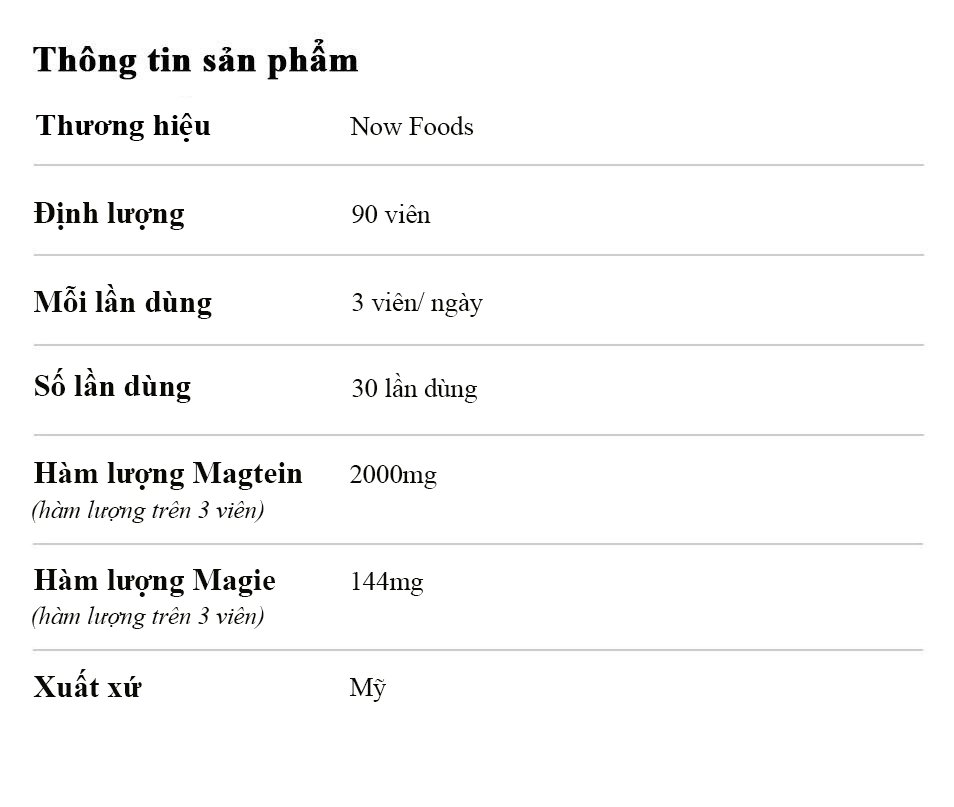 NOW Magtein | Magnesium L-Threonate là thực phẩm bổ sung chứa Magtein® – một dạng Magnesium L-Threonate tiên tiến, giúp tối ưu hóa khả năng hấp thụ magie vào não bộ. Không giống như các dạng magie thông thường, Magtein® đã được nghiên cứu khoa học chứng minh có khả năng cải thiện chức năng nhận thức, tăng cường trí nhớ, hỗ trợ sự tập trung và giúp giảm căng thẳng, lo âu. Bên cạnh đó, sản phẩm còn hỗ trợ giấc ngủ sâu, cải thiện chất lượng giấc ngủ và giúp cơ thể thư giãn hiệu quả. NOW Magtein đặc biệt phù hợp cho những người làm việc trí óc cường độ cao, người cao tuổi có nguy cơ suy giảm trí nhớ, học sinh – sinh viên cần tăng khả năng tập trung và những ai đang tìm kiếm giải pháp để giảm stress, cải thiện giấc ngủ. Với công thức không chứa gluten, sữa hay chất phụ gia độc hại, sản phẩm đảm bảo độ tinh khiết cao và an toàn cho sức khỏe. Sử dụng NOW Magtein hàng ngày sẽ giúp người dùng duy trì tinh thần minh mẫn, nâng cao hiệu suất làm việc, học tập, tập luyện đồng thời bảo vệ sức khỏe não bộ lâu dài. THÀNH PHẦN CHÍNH Định lượng: 90 viên Mỗi lần dùng: 3 viên/ ngày Số lần dùng: 30 lần dùng Thành phần chính (hàm lượng trên 3 viên)