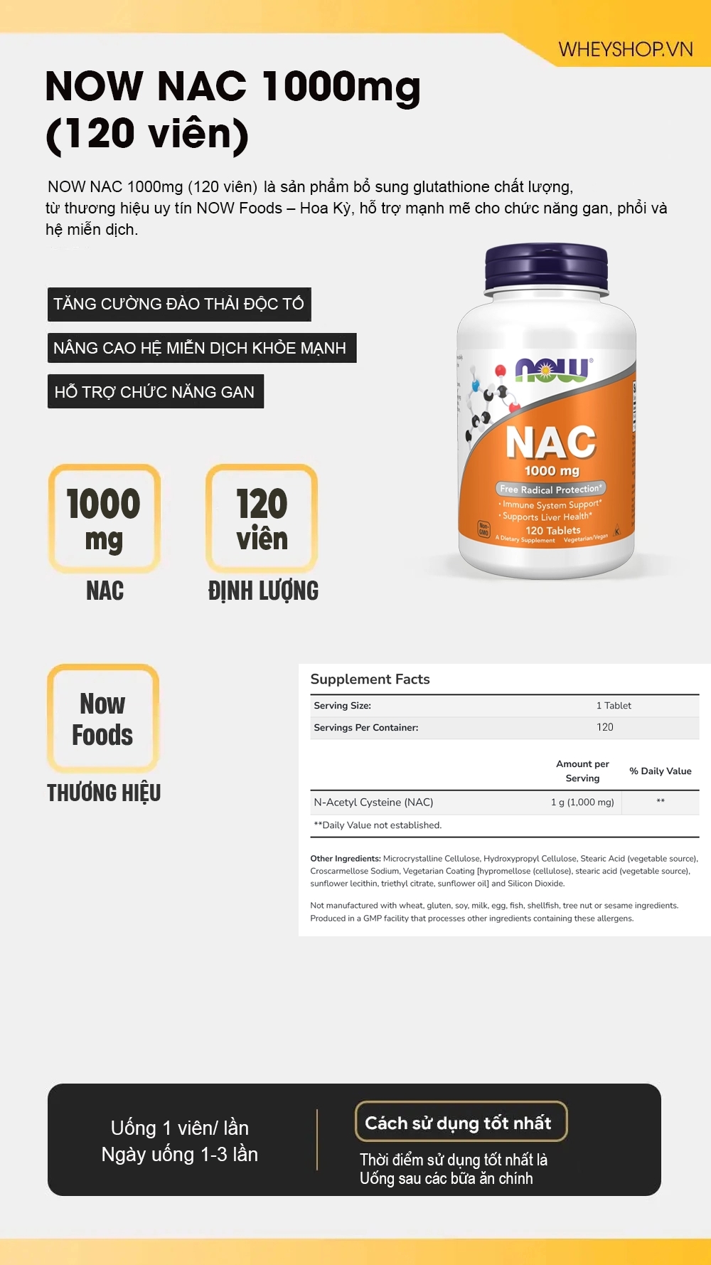 WheyShop là hệ thống bán lẻ thực phẩm bổ sung uy tín hàng đầu tại Việt Nam, được nhiều vận động viên và người tiêu dùng tin tưởng lựa chọn. WheyShop cam kết cung cấp sản phẩm Now NAC 1000mg chính hãng, có đầy đủ giấy tờ chứng nhận nguồn gốc và chất lượng. Đội ngũ tư vấn viên chuyên nghiệp, giàu kinh nghiệm, sẵn sàng hỗ trợ khách hàng lựa chọn sản phẩm phù hợp và giải đáp mọi thắc mắc