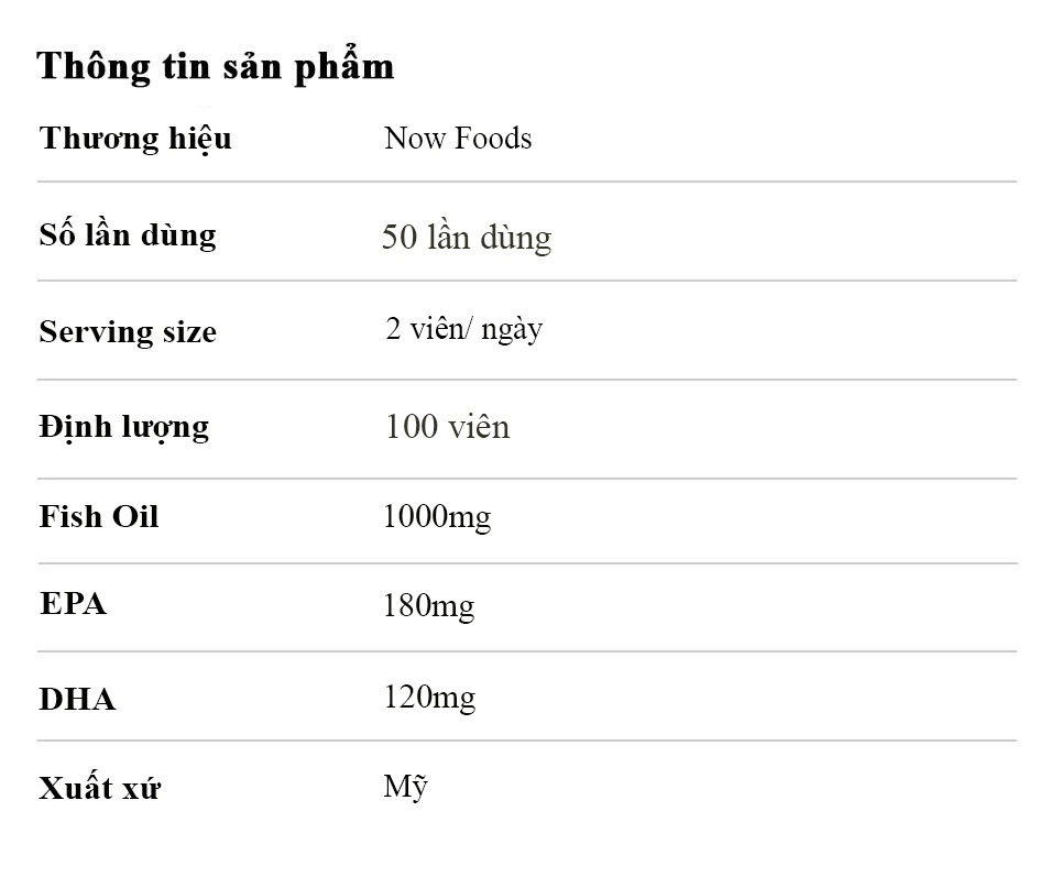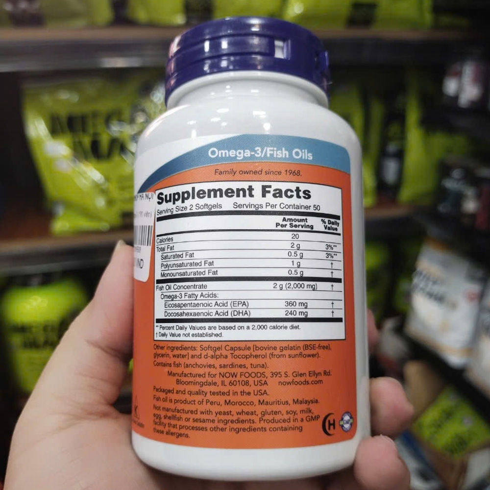 Now Omega 3 là sản phẩm được chiết xuất từ các loại cá, bổ sung 100% Omega-3, một loại axit béo trong nhóm vitamin và khoáng chất rất cần thiết cho cơ thể. Nhưng cơ thể không thể tự tổng hợp được do đó cần phải bổ sung từ thực phẩm bên ngoài. Now Omega 3 cung cấp nguồn Omega 3 cần thiết giúp bạn luôn khỏe mạnh và luôn tràn ngập năng lượng. Omega 3 giúp duy trì một trái tim khỏe mạnh, tăng cường hệ miễn dịch, tăng cường sức khỏe não bộ và không chứa cholesterol nên an toàn khi sử dụng. Now Omega-3 phù hợp với đối tượng người cao tuổi, người có nhu cầu giảm cân, người thiếu hụt dinh dưỡng, những gymer, vận động viên, người tập luyện thể thao. THÀNH PHẦN CHÍNHĐịnh lượng: 100 viên Serving size: 2 viên Số lần dùng: 50 lần sử dụng Thương hiệu: Now Foods Thành phần: