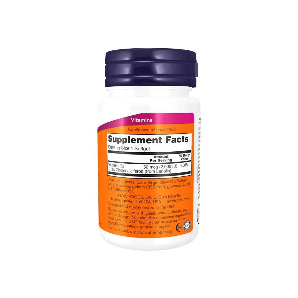 NOW Vitamin D3 2000IU không chứa gluten, sữa, đậu nành và GMO, rất an toàn cho người ăn chay hoặc có chế độ ăn kiêng đặc biệt.