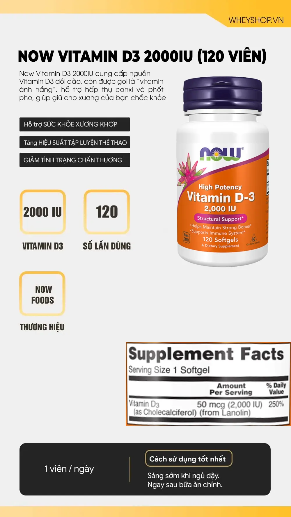 Bạn có thể tìm mua NOW Vitamin D3 2000IU chính hãng, giá tốt tại WheyShop. Chúng tôi luôn cam kết cung cấp sản phẩm chính hãng, có đầy đủ giấy tờ chứng nhận nguồn gốc và chất lượng. Đội ngũ tư vấn viên chuyên nghiệp, giàu kinh nghiệm, giao hàng toàn quốc nhanh chóng.