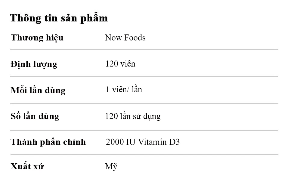 NOW Vitamin D3 2000IU là thực phẩm bổ sung sức khỏe đến từ thương hiệu nổi tiếng NOW Foods (Mỹ), được nhiều chuyên gia khuyên dùng để hỗ trợ xương chắc khỏe và tăng cường miễn dịch. Với hàm lượng 2000IU Vitamin D3 tinh khiết, sản phẩm giúp cơ thể hấp thụ canxi và phốt pho tốt hơn, từ đó cải thiện mật độ xương, hạn chế loãng xương và nâng cao sức đề kháng tự nhiên. NOW Vitamin D3 2000IU phù hợp cho người thường xuyên làm việc trong môi trường thiếu ánh nắng, người lớn tuổi hoặc những ai có nhu cầu bổ sung vitamin D hàng ngày để duy trì sức khỏe lâu dài. THÀNH PHẦN CHÍNHĐịnh lượng: 120 viên Mỗi lần dùng: 1 viên/ ngày Số lần dùng: 120 lần dùng Hàm lượng Vitamin D3 (trong 1 viên): 50mcg (2000IU) Thương hiệu: Now Foods Xuất xứ: Mỹ |