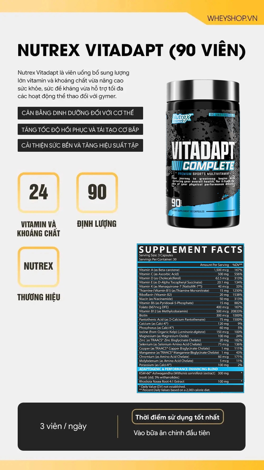 Điểm nổi bật của Nutrex Vitadapt là sự kết hợp giữa vitamin tổng hợp, giúp cơ thể không chỉ nhận đủ chất dinh dưỡng mà còn chịu đựng được áp lực từ tập luyện cường độ cao.