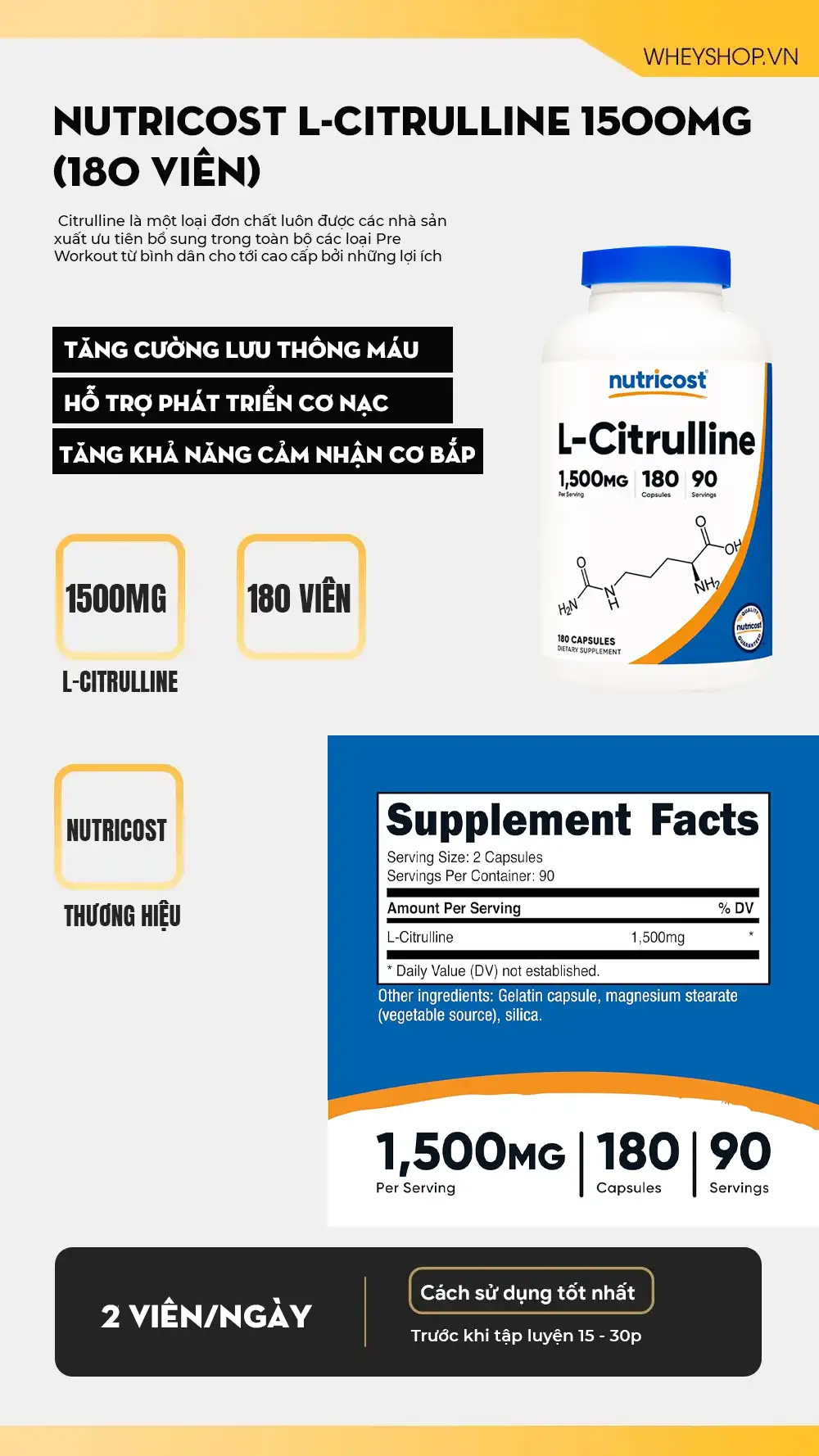 Nutricost L-Citrulline 1500mg là công thức khá gọn: tập trung vào L-Citrulline.