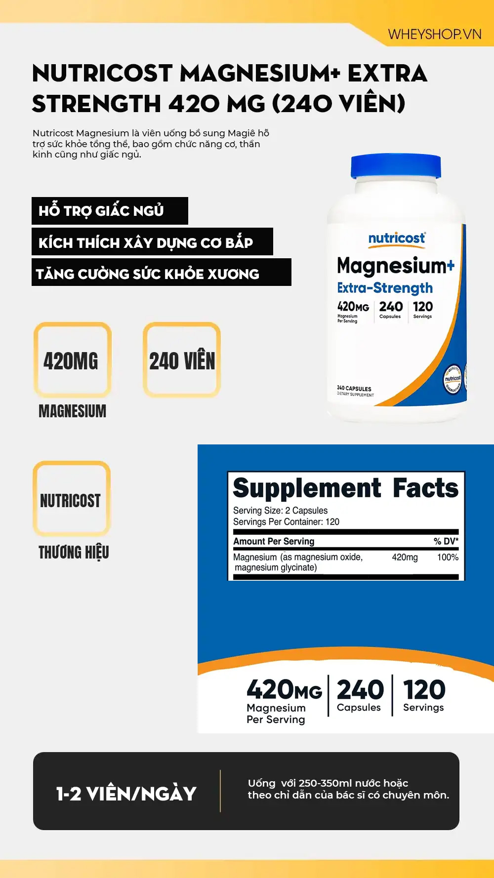 Sản phẩm ghi 420 mg magnesium/serving, giúp bạn dễ tính tổng lượng magnesium đang bổ sung mỗi ngày.
