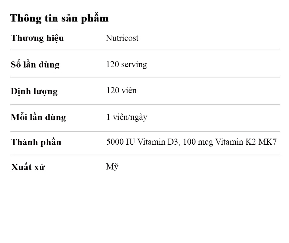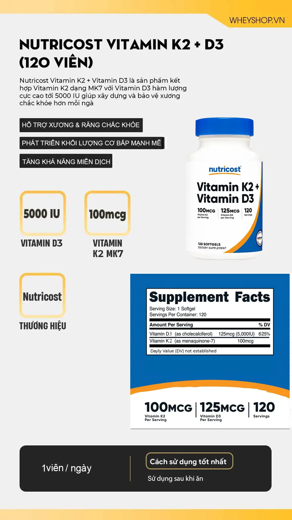 Nutricost Vitamin K2 + D3 là công thức phối hợp 2 vi chất phổ biến trong nhóm hỗ trợ xương: