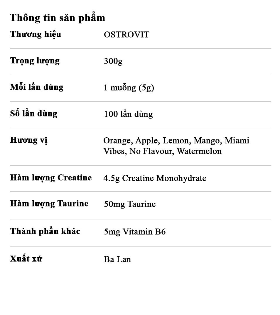 Mục tiêu chính của Creatine chính là tăng hiệu suất tập luyện thể thao, bởi nó có khả năng tăng sức bền, giảm mệt mỏi cơ bắp, suy nhược thể lực, nhanh chóng hồi phục năng lượng. Những điều này cho thấy sử dụng Ostrovit Creatine sẽ giúp bạn thực hiện các bài tập cường độ cao dễ dàng hơn. Cung cấp thêm Taurine