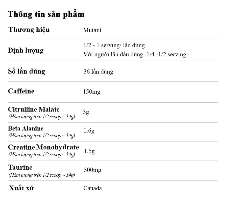 Pre-Workout Madness All-In Mutant là công thức tăng cường sức mạnh vượt trội, giúp bạn đạt hiệu suất tập luyện tối đa. Với 36 servings trong mỗi hộp, sản phẩm cung cấp hỗn hợp caffeine, beta-alanine, citrulline malate và các thành phần tiên tiến khác, giúp tăng sức bền, cải thiện lưu thông máu và tối ưu hiệu suất cơ bắp. Sử dụng Pre-workout Mutant Madness trước khi tập giúp bạn duy trì tinh thần tập trung, giảm mệt mỏi và bùng nổ năng lượng trong suốt buổi tập. Đây là lựa chọn lý tưởng cho những ai muốn nâng cao sức mạnh, độ bền và sự bứt phá. THÀNH PHẦN CHÍNHĐịnh lượng: 504g Mỗi lần dùng: 1/2 - 1 serving/ lần dùng Với người lần đầu dùng: 1/4 -1/2 serving Thành phần chính (hàm lượng trên 1/2 muỗng)
