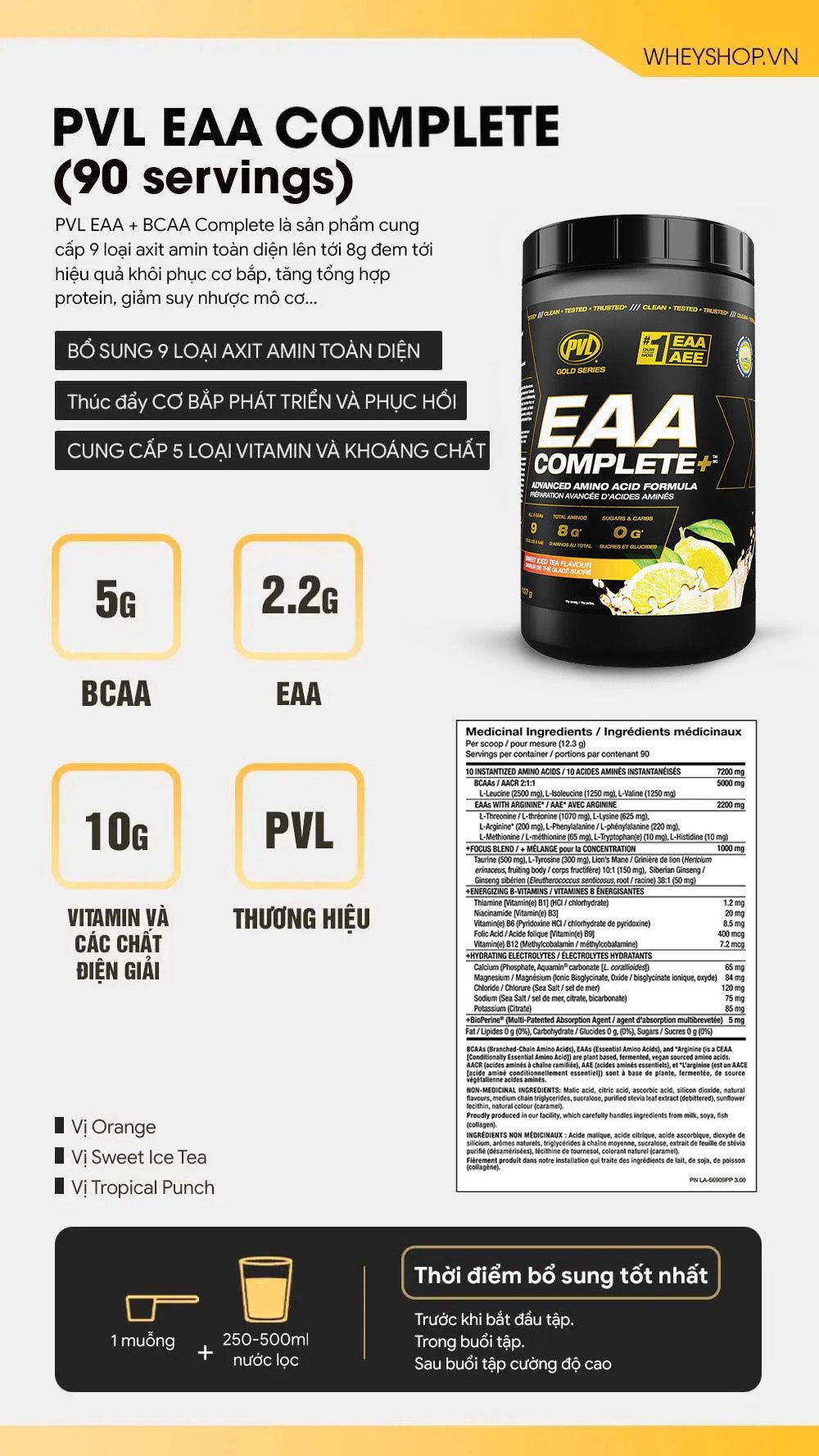 PVL EAA Complete là sản phẩm cung cấp 9 loại axit amin thiết yếu cho cơ thể, trong đó bao gồm BCAA - axit amin chuỗi nhánh và L-arginine. Đặc biệt, đối với người tập luyện thể thao, axit amin đem tới nhiều công dụng bao gồm: giảm đau nhức, suy nhược cơ bắp, tăng tốc độ khôi phục mô cơ, tăng sức bền,... Những điều này đều giúp bạn tăng hiệu suất thể chất như mong muốn.