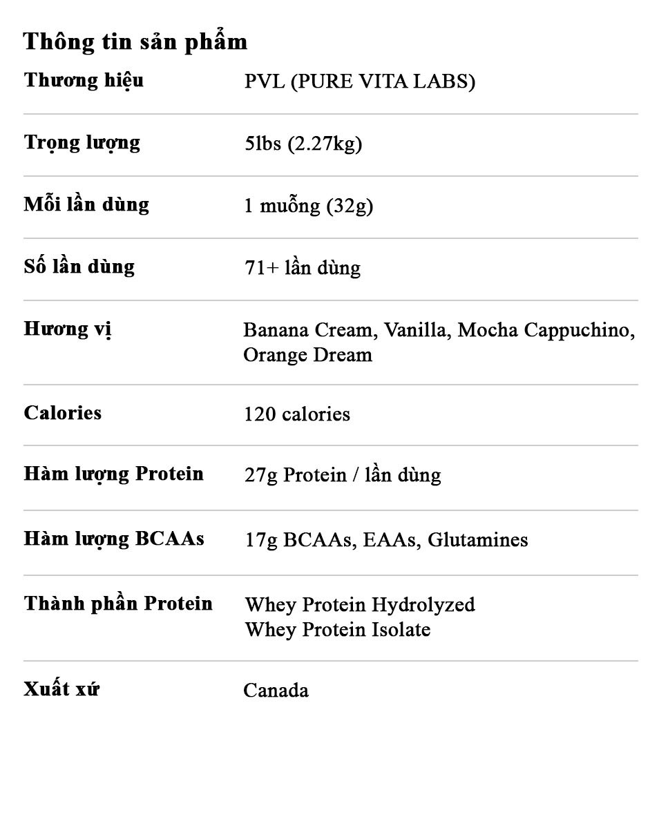 PVL Iso Gold là sản phẩm sữa bột hỗ trợ tăng cơ, phục hồi cơ bắp với 27g protein và 17g hỗn hợp axit amin chất lượng cao, tinh khiết dành cho người tập thể hình và vận động viên chuyên nghiệp. Sử dụng thành phần Whey Protein Isolate và Whey Protein Hydrolyzed đã loại bỏ hầu hết tạp chất, giúp cơ thể hấp thu nhanh hơn. Đồng thời, để cải thiện hệ tiêu hóa, sản phẩm bổ sung 1 tỷ lợi khuẩn và enzyme. PVL Iso Gold tập trung nhiều vào hương vị, đảm bảo tất cả mọi người đều được trải nghiệm hương vị tuyệt vời, ngọt dịu. Sản phẩm sữa tăng cơ của thương hiệu PVL được nhiều người lựa chọn là sản phẩm tăng cơ hàng đầu hiện nay. THÀNH PHẦN CHÍNHTrọng lượng: 5Lbs ∼ 2.27kg Hàm lượng : 27g protein / lần dùng Thành phần protein: Whey Protein Isolate Whey Protein Hydrolyzed Amino Acids: 17g hỗn hợp EAA, BCAA, Glutamines Thành phần khác: Vitamin và khoáng chất Số lần dùng (servings): 71+ lần dùng Thương hiệu: PVL |