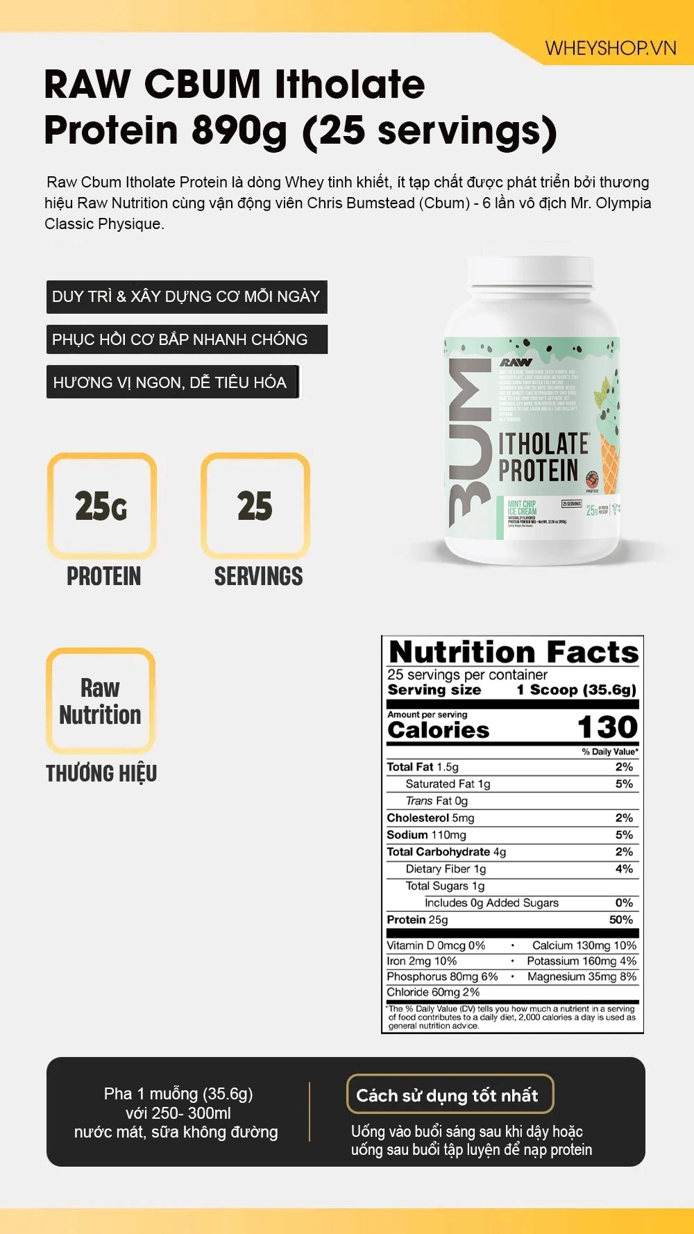 Raw Cbum Itholate Protein là dòng whey protein isolate tinh khiết đến từ thương hiệu RAW Nutrition, được hợp tác phát triển cùng vận động viên thể hình huyền thoại Chris Bumstead (Cbum) – 6 lần vô địch Mr. Olympia Classic Physique. Sản phẩm được sản xuất với công nghệ lọc vi mô (Micro-Filtered), mỗi khẩu phần cung cấp 25g protein tinh khiết, dễ hấp thụ và nhanh chóng nuôi dưỡng, phục hồi cơ bắp hiệu quả. Hương vị thơm ngon, dễ uống không gây ngấy. Hàm lượng Calo thấp, cực ít hoặc hầu như không chưa chất béo & đường. ƯU ĐIỂM NỔI BẬT