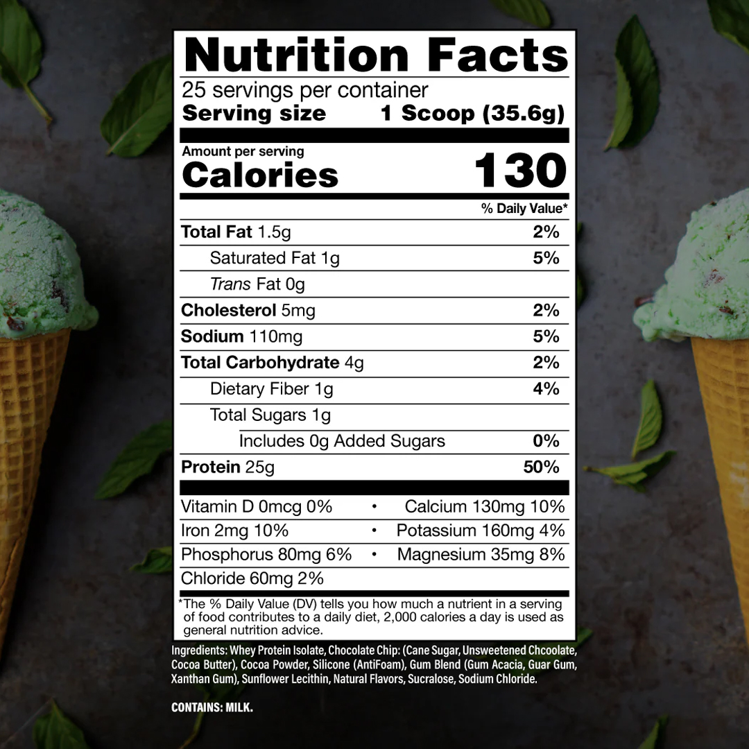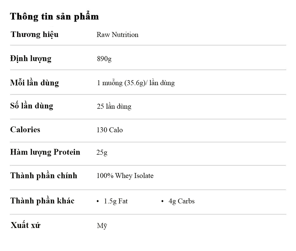 Định lượng: 890g Số lần dùng: 25 lần dùng Mỗi lần dùng: 1 muỗng (35.6g)/ lần dùng Calories: 130 Calo Hàm lượng Protein: 25g Thành phần chính: 100% Whey Isolate Thành phần khác: