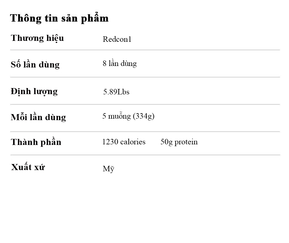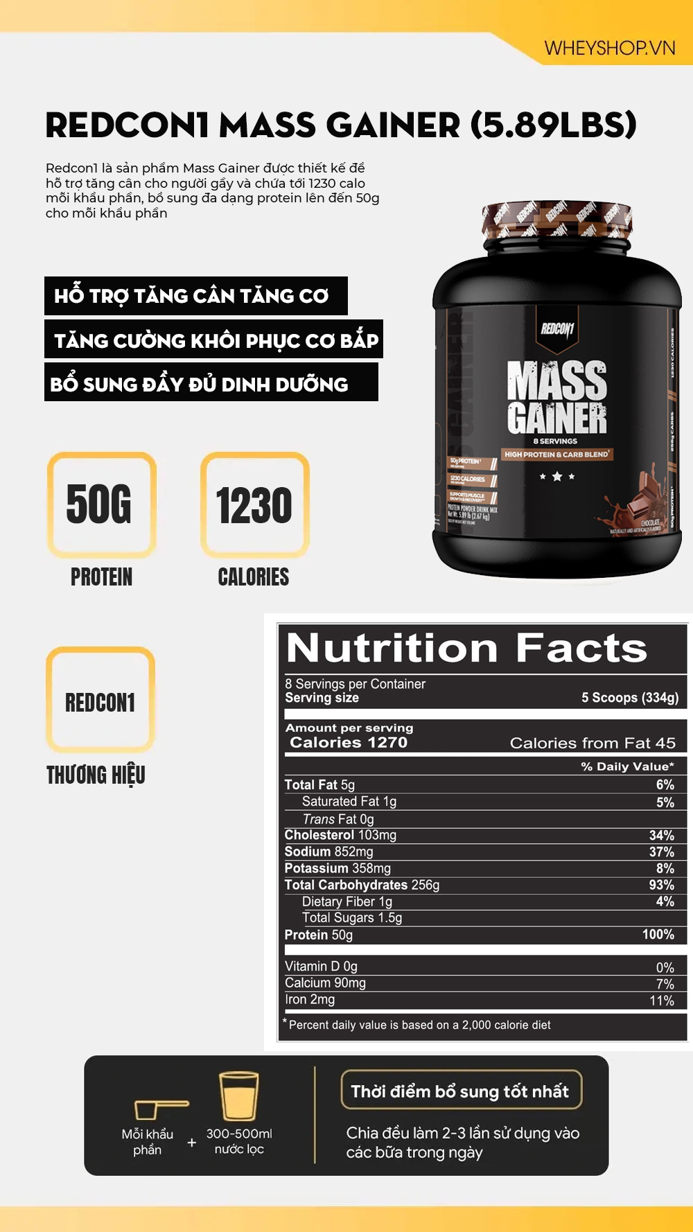 Nếu bạn đang tìm một dòng mass gainer chính hãng, calories cao, protein cao để hỗ trợ tăng cân và tăng size rõ hơn, Redcon1 Mass Gainer (5.89Lbs) là lựa chọn đáng cân nhắc.