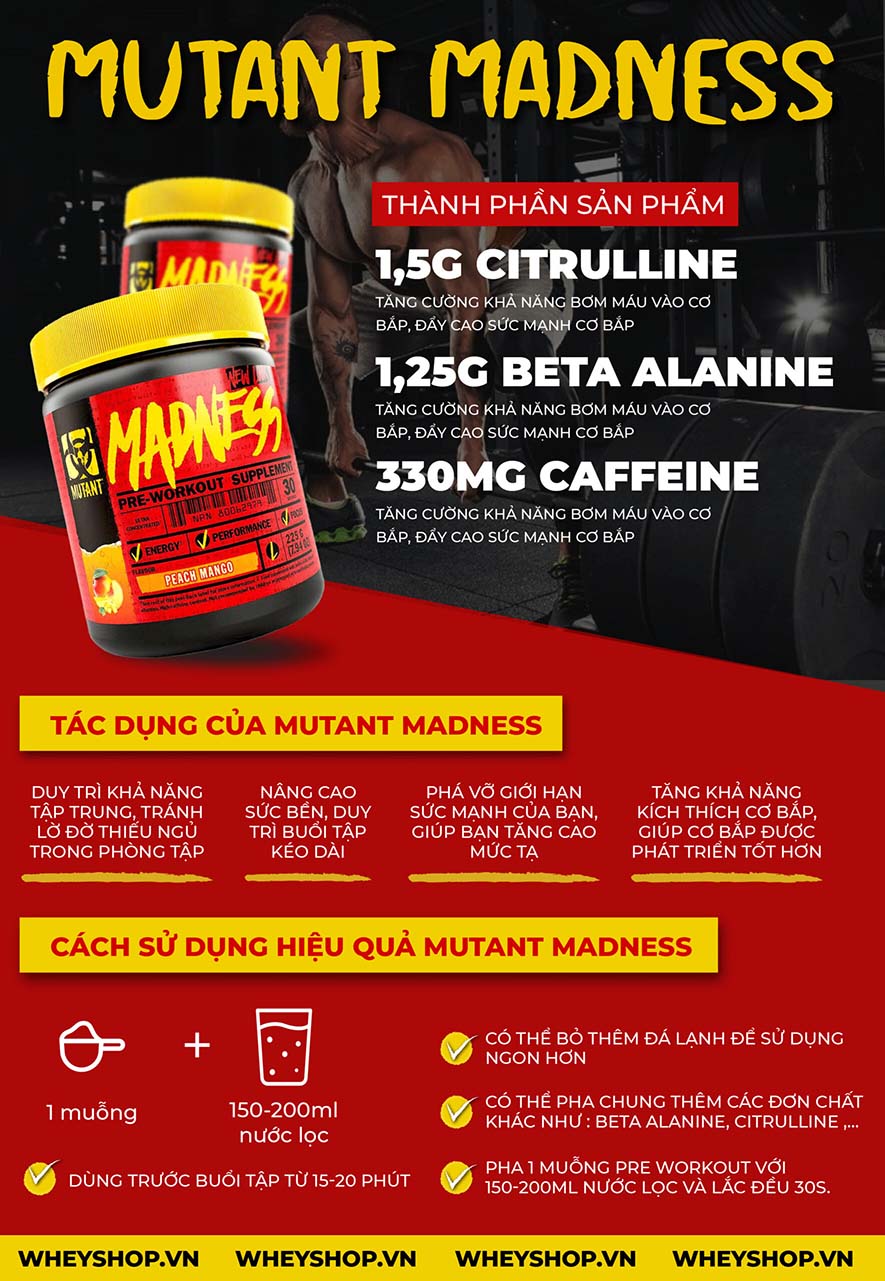 Mutant Madness là một trong những thức uống Pre-workout trước khi tập luyện phổ biến nhất hiện nay. WheyShop đã review đánh giá Mutant Madness có tốt không. Từ đây bạn dễ dàng lựa chọn sản phẩm pre workout tăng sức mạnh phù hợp với bạn. Nếu bạn cần tư vấn thêm về sản phẩm đừng quên để lại lời nhắn nhé!