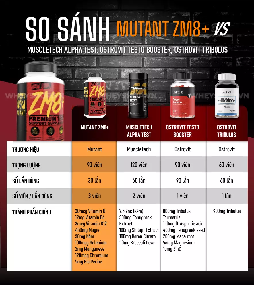 Mặt khác, Ostrovit Testo Booster bổ sung thêm nhiều thành phần tăng cường nội tiết tố lành tính được chiết xuất hoàn toàn tự nhiên. Trong khi review đánh giá Mutant ZM8+ bổ sung các loại vitamin và khoáng chất khác nhau vừa tập trung tăng testosteron, vừa tăng cường sức khỏe tổng thể.