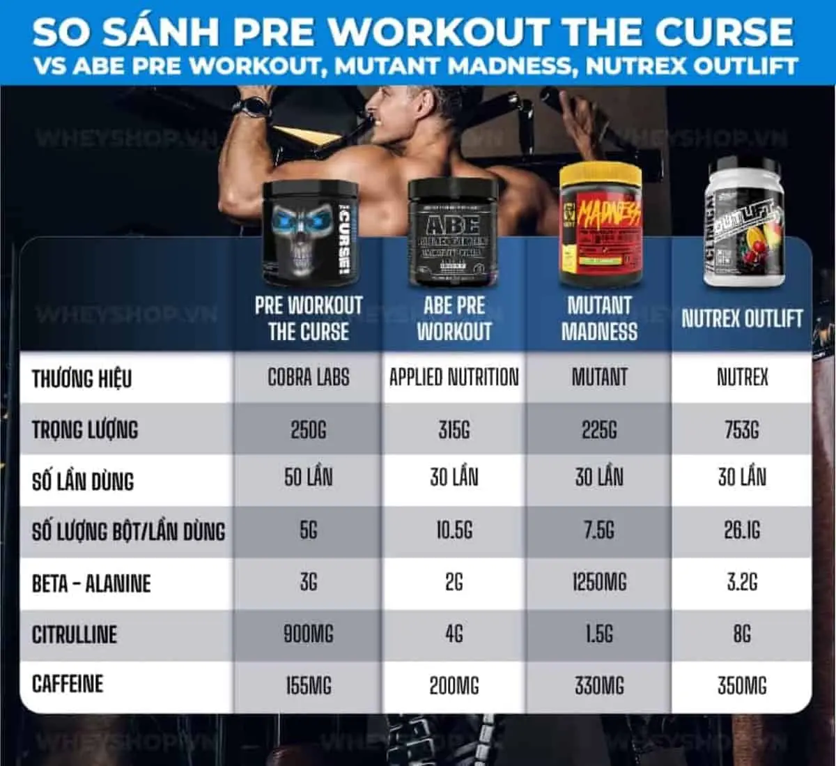 3. So sánh đánh giá Pre workout The Curse vs ABE Pre workout, Mutant Madness, Nutrex Outlift