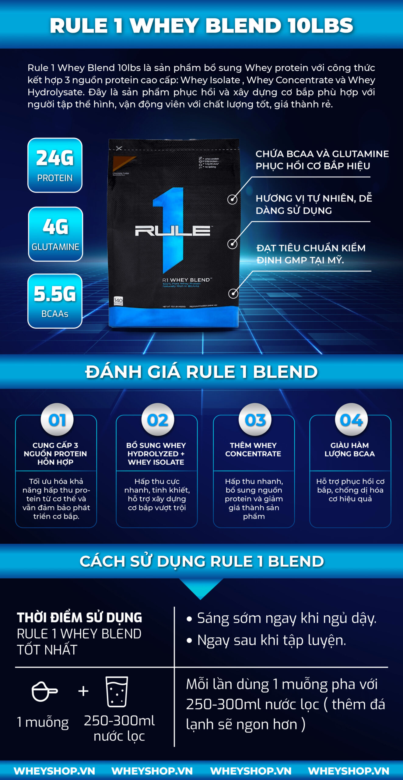 - Thời điểm sử dụng Rule 1 Whey Blend tốt nhất là sáng sớm ngay khi ngủ dậy và ngay sau khi tập luyện xong.