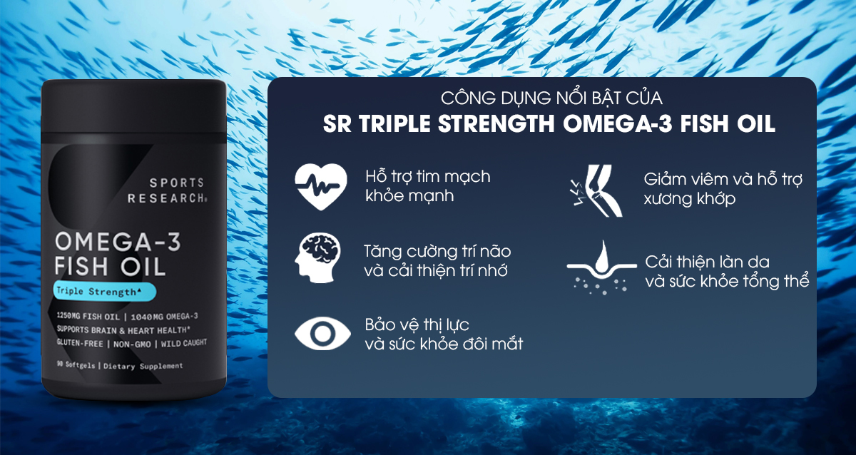 Trong số các sản phẩm bổ sung Omega-3 trên thị trường hiện nay, SR Triple Strength Omega-3 Fish Oil của thương hiệu Sports Research (Mỹ) được đánh giá là một trong những lựa chọn hàng đầu nhờ công thức Triple Strength – mạnh gấp 3 lần so với dầu cá thông thường.