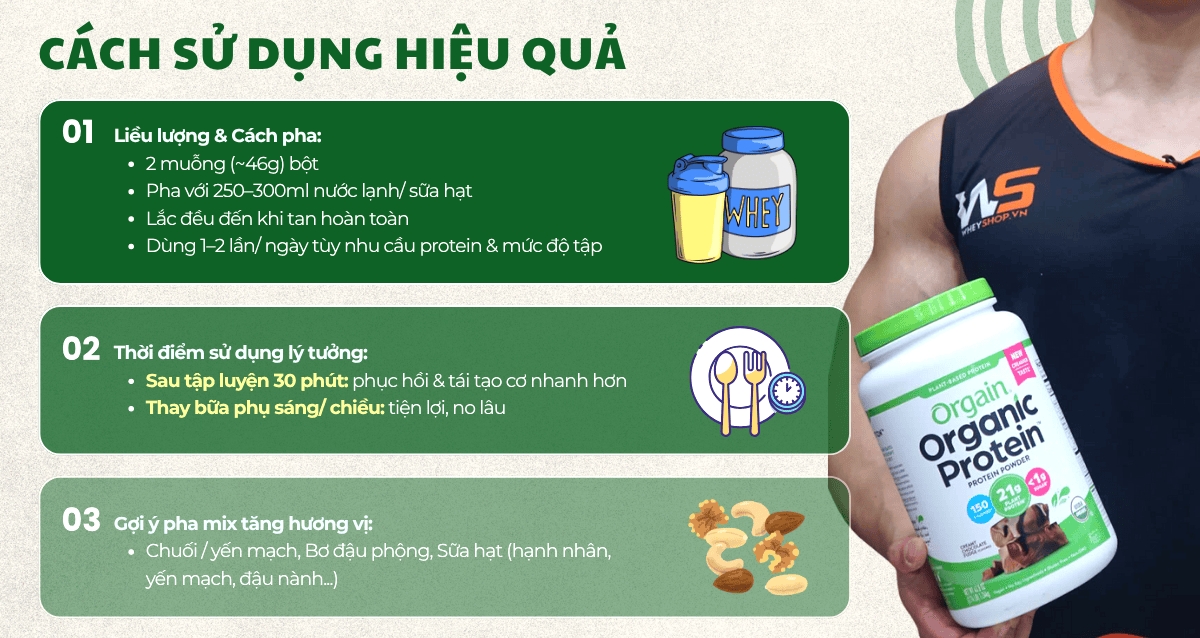 Để đạt hiệu quả tối ưu, bạn nên sử dụng Orgain Organic Protein đúng thời điểm và liều lượng hợp lý. Cách pha hiệu quả nhất là pha 2 muỗng (khoảng 46g) với 250–300ml nước lạnh hoặc sữa hạt, lắc đều cho tan hoàn toàn. Có thể dùng 1–2 lần mỗi ngày, tùy theo nhu cầu protein và cường độ tập luyện của bạn. Thời điểm lý tưởng nhất là uống sau tập luyện 30 phút để phục hồi cơ bắp. Ngoài ra, bạn cũng có thể dùng thay bữa phụ vào buổi sáng hoặc chiều.