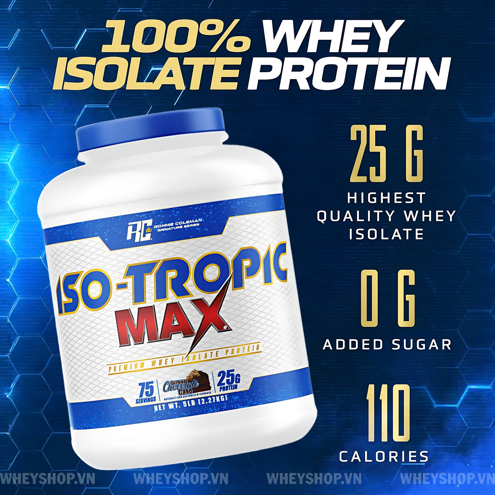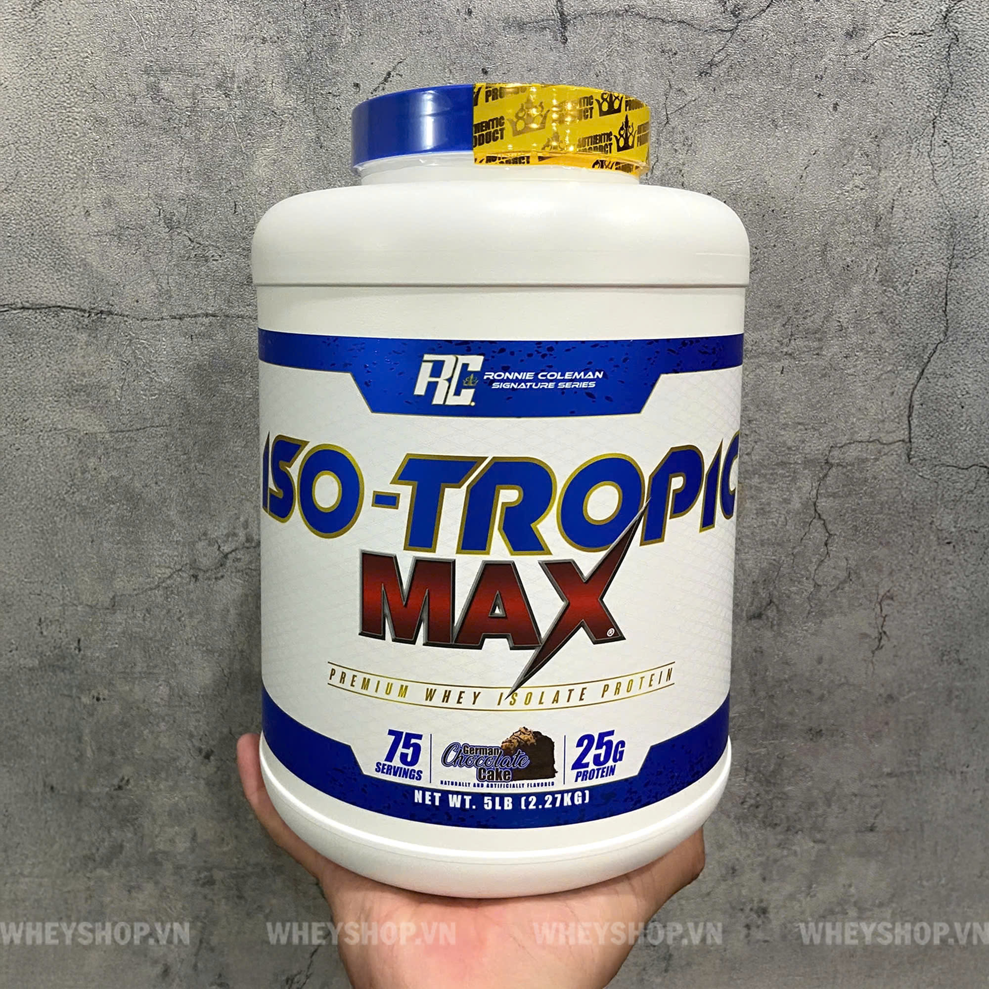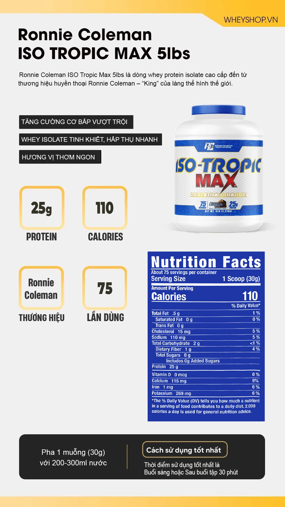 Ronnie Coleman ISO Tropic Max là dòng whey protein isolate cao cấp đến từ thương hiệu huyền thoại Ronnie Coleman – “King” của làng thể hình thế giới. Sản phẩm được sản xuất với công nghệ lọc tiên tiến, mang đến nguồn protein tinh khiết tới 90%, hấp thu siêu nhanh, giúp nuôi dưỡng và phục hồi cơ bắp tối ưu sau mỗi buổi tập. Với 0g đường, cực ít chất béo và 83% Protein trong mỗi khẩu phần, ISO Tropic Max là lựa chọn lý tưởng cho người tập gym muốn tăng cơ nạc, siết cơ hay giảm mỡ mà vẫn đảm bảo đủ dinh dưỡng. THÀNH PHẦN CHÍNHĐịnh lượng: 5Lbs (2.27kg) Số lần dùng: 75 lần dùng Mỗi lần dùng: 1 muỗng (30g) Hàm lượng Calo: 110 Calo Hàm lượng Protein: 25g Thành phần chính: 100% Whey Isolate Thành phần khác: