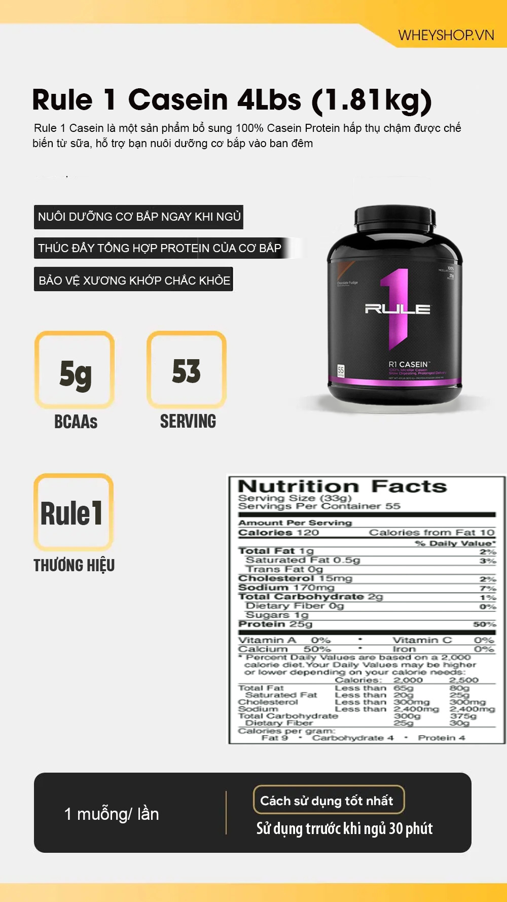 Rule 1 Casein giúp bổ sung nguồn protein hấp thụ chậm (khoảng 8 tiếng) để nuôi dưỡng cơ bắp của bạn vào ban đêm, để cơ không bị “đói” và hạn chế tối đa hiện tượng dị hóa cơ bắp.
