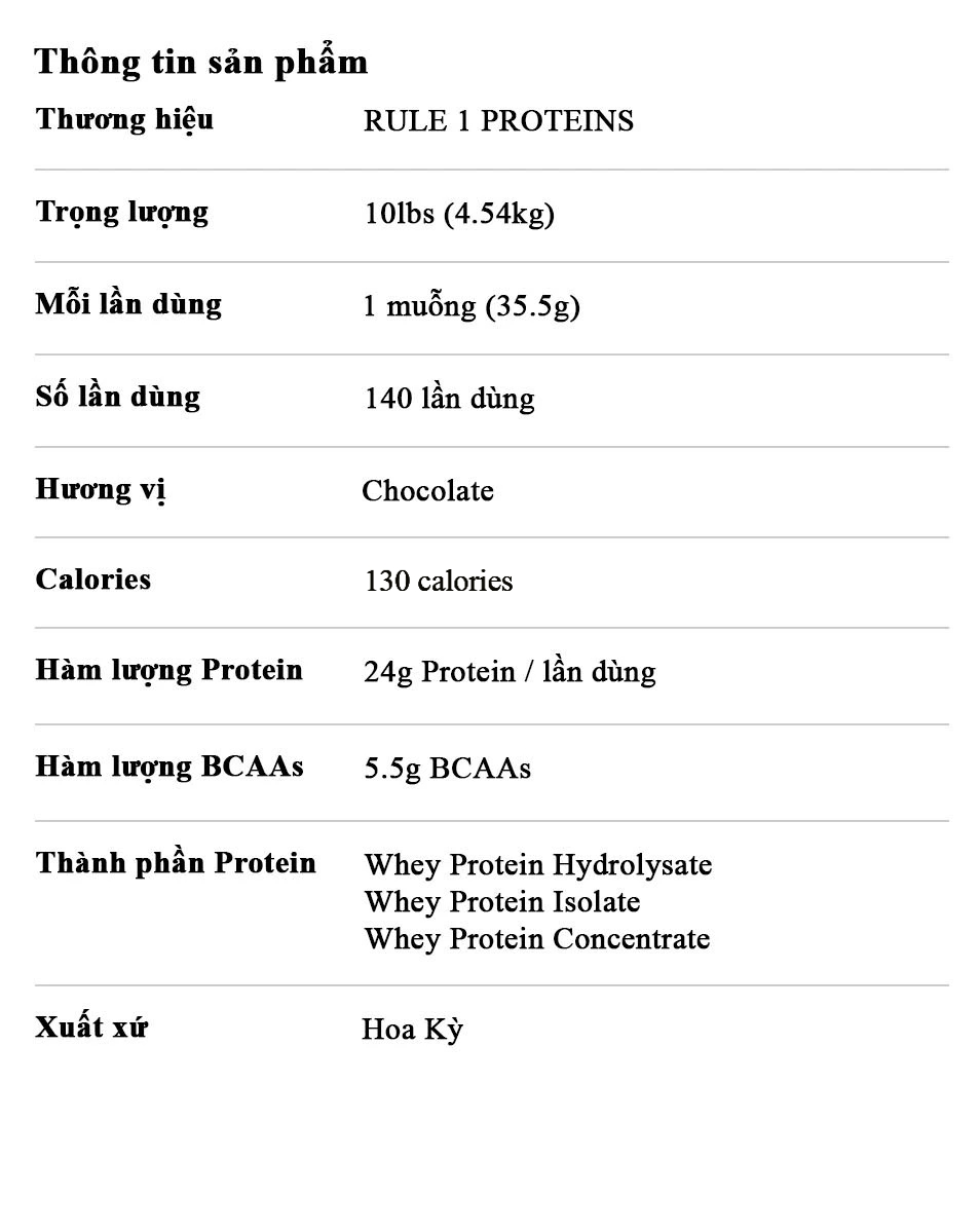Thành phần Rule 1 Whey BlendTrọng lượng: 10Lbs ~ 4.54kg Hàm lượng: 24g protein/lần dùng Thành phần protein: