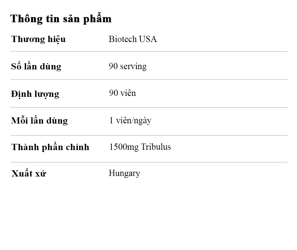 BioTech Tribulus Maximus là sản phẩm cung cấp tới 1500mg Tribulus chất lượng cao đem tới hiệu quả hỗ trợ tăng cường lượng Testosterone trong cơ thể. Testosterone không những đảm nhiệm vai trò cải thiện sinh lý nam giới, mà còn hỗ trợ hoạt động thể thao mạnh mẽ. Khả năng phát triển và phục hồi cơ bắp, tăng sức bền một phần còn dựa trên hàm lượng Testosterone trong cơ thể. BioTech - Tribulus Maximus được sản xuất bởi BiotechUSA - 1 thương hiệu hàng đầu quốc tế trong thế giới thực phẩm bổ sung. Để nâng cao năng suất và thể trạng trong hoạt động thể thao, BioTech Tribulus là đề xuất tốt nhất trên thị trường hiện nay. THÀNH PHẦN CHÍNH
