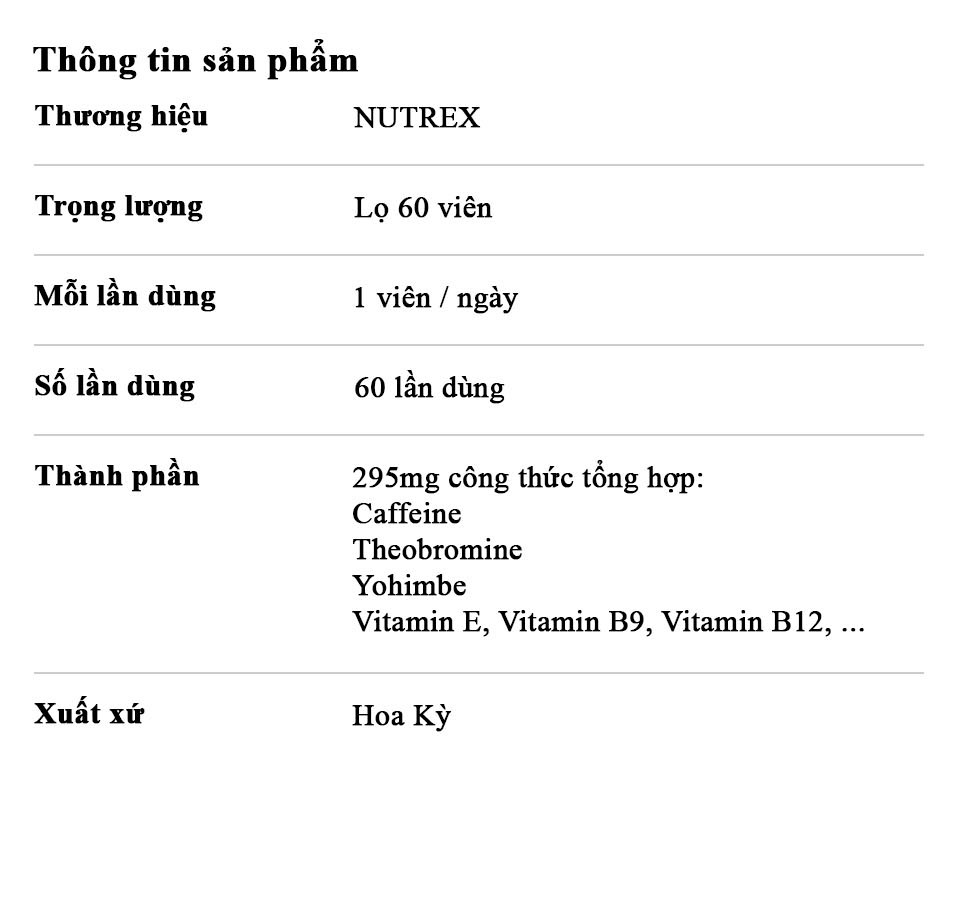 Một công thức hỗ trợ giảm cân chuyên biệt dành riêng cho nữ: Lipo 6 Black Hers là sản phẩm hỗ trợ kích thích khả năng tập hợp và hấp thụ dưỡng chất nhanh chóng, sinh nhiệt được chiết xuất hoàn toàn tự 100% tự nhiên, mang tới hiệu quả tuyệt vời trong việc cải thiện vóc dáng, dành cho chị em phụ nữ tập gym, tập thể hình sử dụng. Lipo 6 Black Hers hỗ trợ cải thiện hiệu suất tập luyện bền bỉ hơn, giảm thèm ăn hỗ trợ ăn kiêng hiệu quả. Hiệu quả sẽ được tăng lên đáng kể nếu như đối tượng sử dụng kết hợp với chế độ ăn kiêng và tập luyện phù hợp, Lipo 6 Black Hers giúp kiềm chế cơn thèm ăn của bạn. THÀNH PHẦN CHÍNH Thành phần chính: Lipo 6 Black Hers Định lượng: 60 viên Serving size: 1 viên / lần Số lần dùng: 60 lần sử dụng Thương hiệu: Nutrex Thành phần: 305 mg công thức tổng hợp
