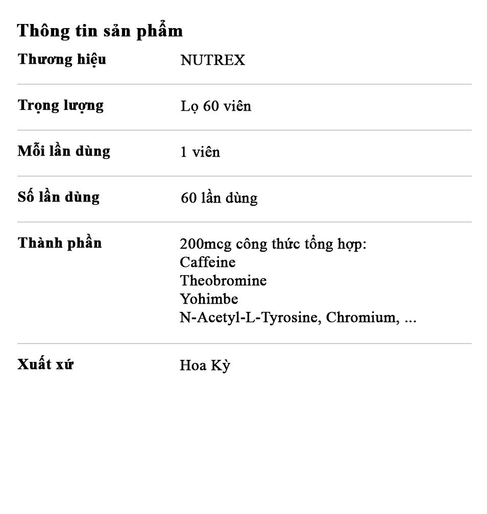 Lipo 6 Black là một sản phẩm hỗ trợ giảm cân nặng hiệu quả của hãng Nutrex - thương hiệu lớn về thực phẩm bổ sung tại Mỹ với hàng loạt sản phẩm nổi danh như : Tăng sức mạnh Outlift, Sữa tăng cân Mass Infusion , Whey tăng cơ ISO Fit, ... Lipo 6 Black là sản phẩm hỗ trợ giảm cân toàn diện nhất hiện nay, tập trung tỉnh táo mang lại cho bạn một thân hình như ý muốn với thành phần lành tính, an toàn cho sức khỏe. Mỗi ngày sử dụng 1 viên Lipo 6 Black vừa giúp đốt mỡ mạnh mẽ, vừa không gây ra những tác dụng phụ nào khác. Lipo 6 Black Ultra hỗ trợ giảm cân thật khoa học với các thành phần Caffeine, Theobromine, Yohimbe,... tăng sinh nhiệt, tăng trao đổi chất. Đồng thời, sử dụng Lipo 6 Black Ultra Concentrate đều đặn sẽ giúp bạn kiểm soát cơn đói của mình và giảm hàm lượng thực phẩm nạp vào cơ thể. Lipo 6 Black Ultra Concentrate phù hợp với đối tượng cần giảm cân nhanh chóng và an toàn, đối tượng muốn loại bỏ mỡ thừa và những người tập luyện thể thao, vận động viên thể hình. |