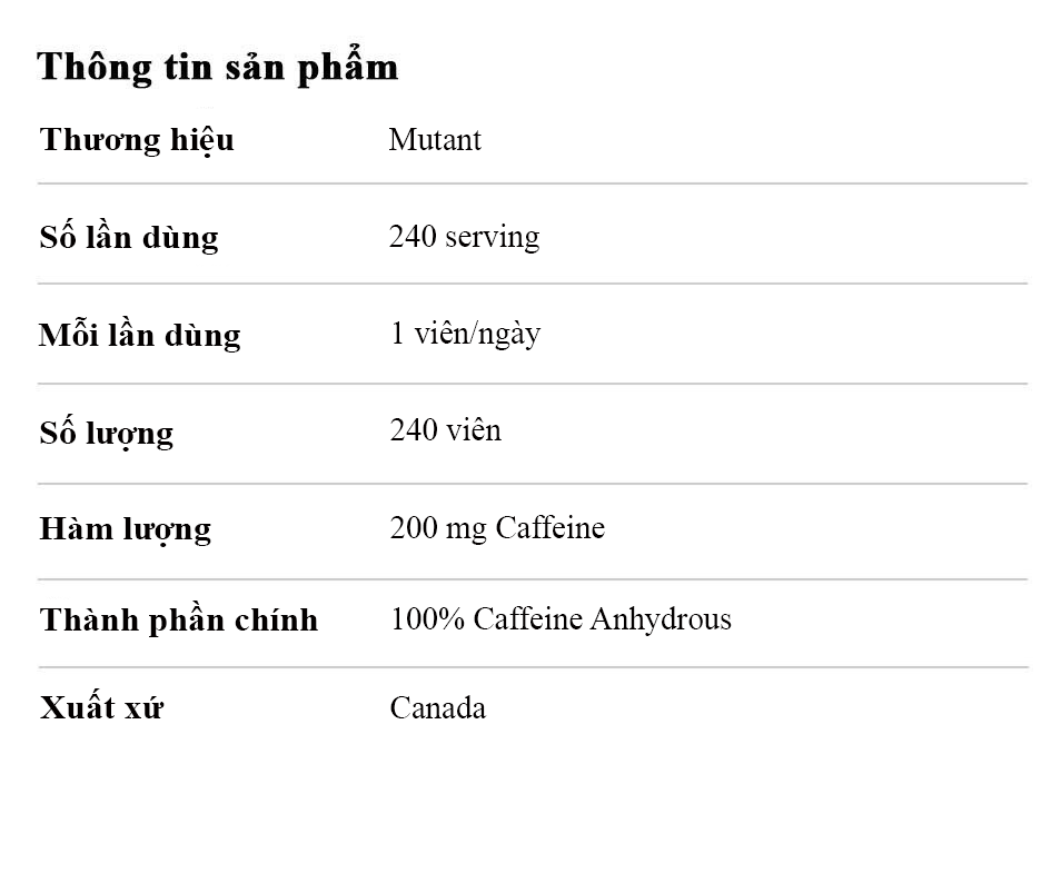 THÀNH PHẦN CHÍNH Hàm lượng: 200 mg Caffeine Số lần dùng (serving size): 240 viên Thành phần chính: 100% Caffeine Anhydrous Xuất xứ : Canada Thương hiệu : Mutant |