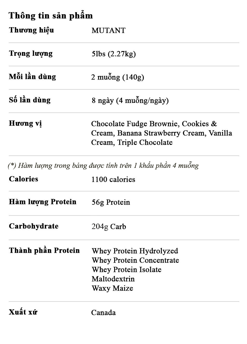Trên thị trường có rất nhiều dòng sản phẩm Mass Gainer nhưng không phải ai cũng có thời gian tìm hiểu kỹ lưỡng từng sản phẩm và có kiến thức lựa chọn được 1 sản phẩm tốt cho mình, đúng với mục đích của bản thân. Một serving Mutant Mass cung cấp cho bạn 1100 calories, 55g protein và hỗn hợp tinh bột cùng chất béo có lợi với MCT's kèm thêm Glutamine, Cinnulin PF® chiết suất từ quế, bột hạt lanh và sữa non nhằm nâng cao hiệu suất tăng cân, tăng cơ bắp và phục hồi cơ bắp của Mutant Mass. THÀNH PHẦN CHÍNHTrọng lượng: 5 lbs ~ 2.3 kg Số lần dùng (servings): 8 ngày (4 muỗng/ ngày) Thành phần chính: