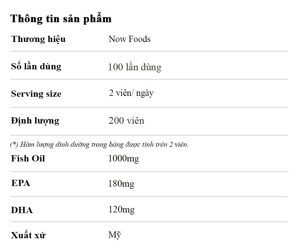 Now Omega 3 là sản phẩm được chiết xuất từ các loại cá, bổ sung 100% Omega-3, một loại axit béo trong nhóm vitamin và khoáng chất rất cần thiết cho cơ thể. Nhưng cơ thể không thể tự tổng hợp được do đó cần phải bổ sung từ thực phẩm bên ngoài. Now Omega 3 cung cấp nguồn Omega 3 cần thiết giúp bạn luôn khỏe mạnh và luôn tràn ngập năng lượng. Omega 3 giúp duy trì một trái tim khỏe mạnh, tăng cường hệ miễn dịch, tăng cường sức khỏe não bộ và không chứa cholesterol nên an toàn khi sử dụng. Now Omega-3 phù hợp với đối tượng người cao tuổi, người có nhu cầu giảm cân, người thiếu hụt dinh dưỡng, những gymer, vận động viên, người tập luyện thể thao. THÀNH PHẦN CHÍNHĐịnh lượng: 200 viên Serving size: 2 viên Số lần dùng: 100 lần sử dụng Thương hiệu: Now Foods Thành phần (hàm lượng trên 2 viên)