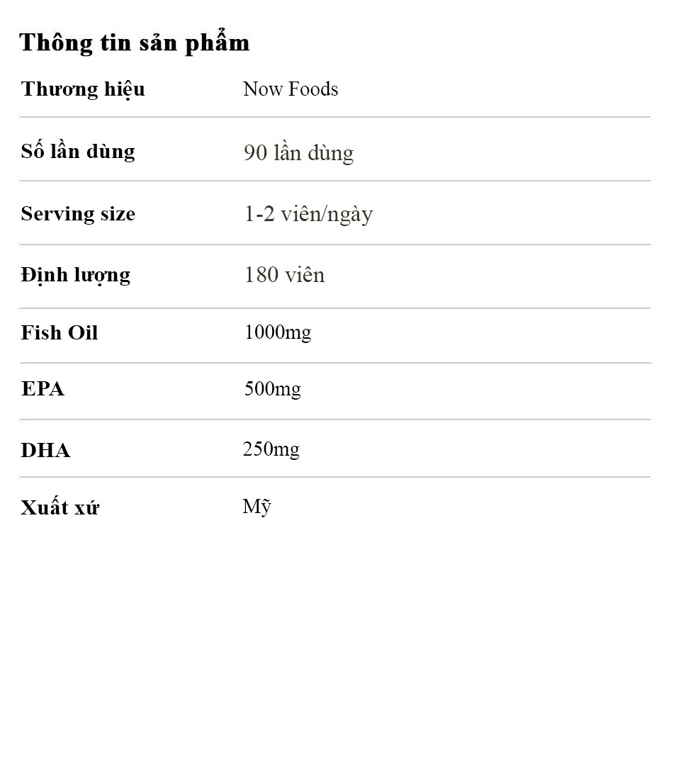 Now Omega-3 Ultra là viên uống dầu cá giúp cải thiện sức khỏe. Sản phẩm chứa 500mg EPA và 250mg DHA. Nó không chỉ tốt cho não mà còn tốt cho tim. Omega-3 là chất béo tốt cho những người tập gym và giúp nuôi dưỡng cơ bắp. Ngoài ra, Now Omega-3 Ultra còn hỗ trợ giảm viêm và tăng cường khả năng phục hồi sau tập luyện. Đây là lựa chọn tối ưu cho gymer muốn vừa khỏe mạnh từ bên trong, vừa cải thiện hiệu suất tập luyện. Now Foods là thương hiệu thực phẩm bổ sung nổi tiếng. Họ có quy trình sản xuất và kiểm định rất nghiêm ngặt. Vì vậy, Now Omega-3 Ultra an toàn cho người dùng và không gây hại cho sức khỏe. THÀNH PHẦN CHÍNHĐịnh lượng: 180 viên Serving size: 1-2 viên/ ngày Số lần dùng: 90 lần sử dụng Thương hiệu: Now Foods Thành phần (hàm lượng trên 1 viên)