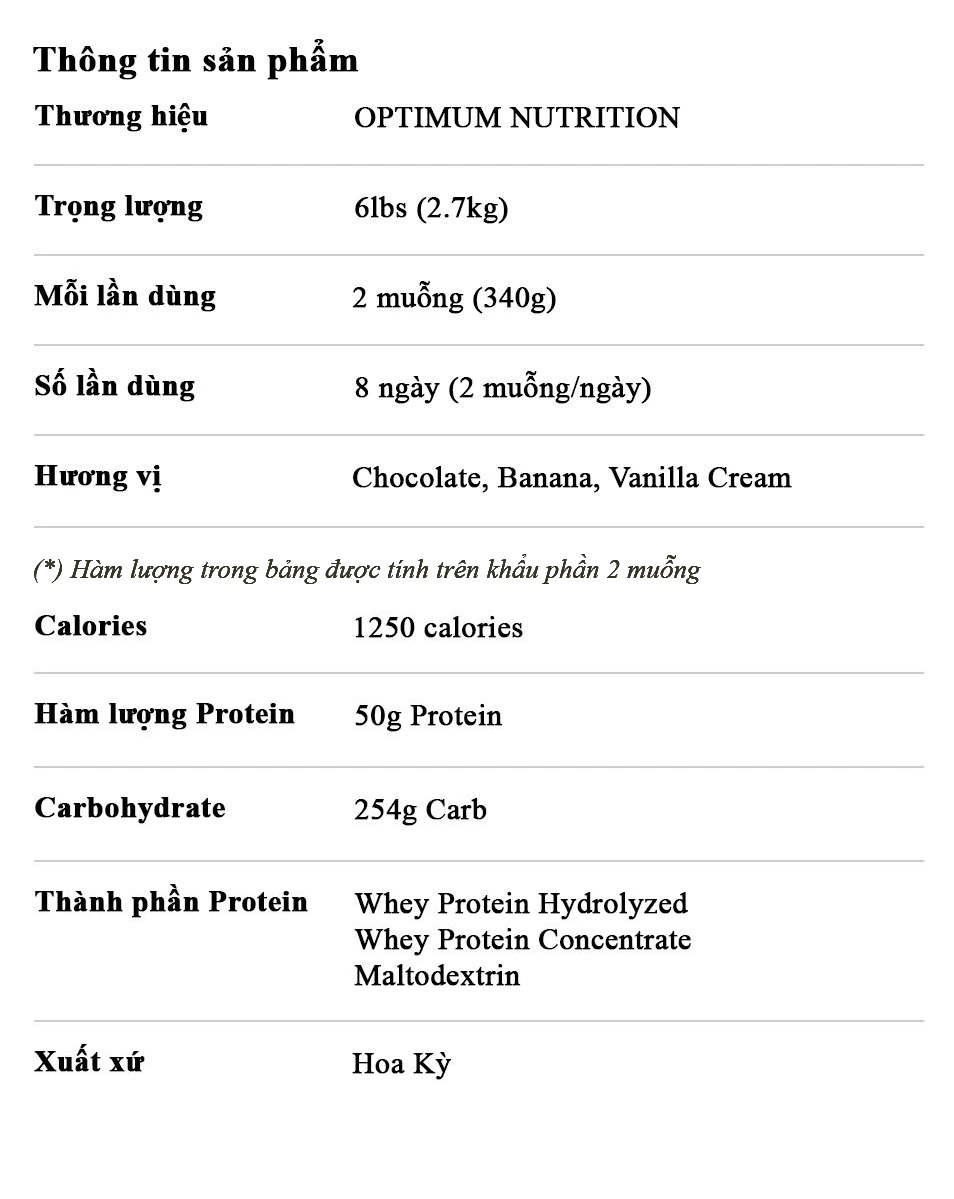 Số lần dùng (servings): 8 ngày (2 muỗng/ngày) Thành phần chính: Maltodextrin, Whey protein concentrate, Whey protein isolate Thành phần khác: Creatine, 25+ Vitamin, khoáng chất thiết yếu, ... Thương hiệu: Optimum Nutrition (ON) Hương vị: Chocolate, Vanilla, Banana,... |