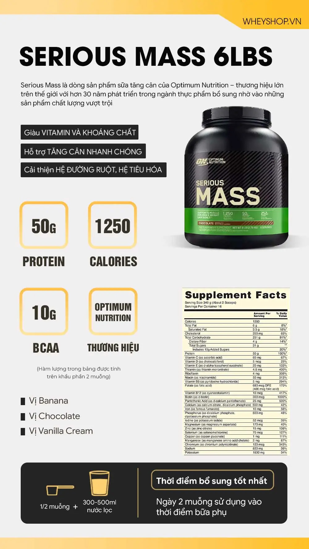 Serious Mass 6Lbs là sản phẩm Mass Gainer được điều chế từ thương hiệu hàng đầu Optimum Nutrition.