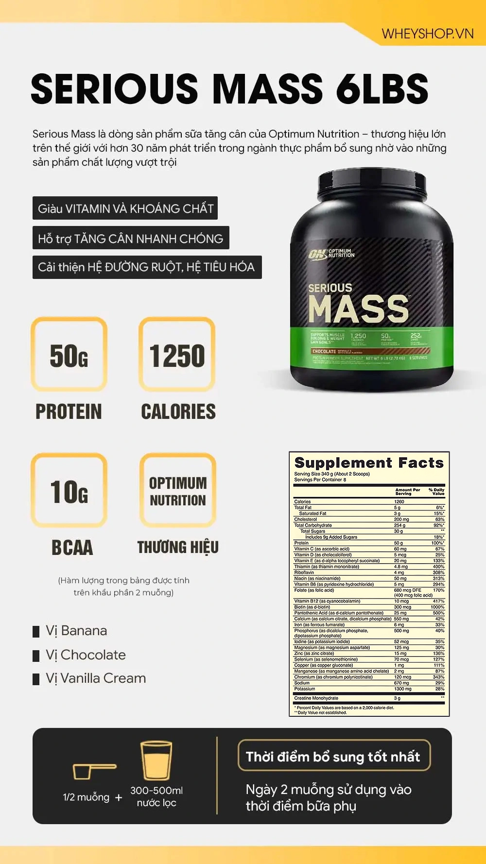 Mỗi lần dùng của Serious Mass 6Lbs cung cấp: 1.250 calories + 50g Protein + 25 loại Vitamin, khoáng chất,... giúp cải thi ện hấp thu dinh dưỡng, bổ sung nguồn năng lượng giúp thay thế bữa ăn phụ, tăng cân nhanh, hiệu quả và hoàn toàn tự nhiên.