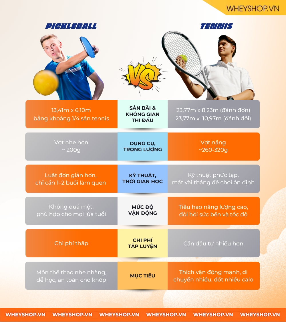 Trong những năm gần đây, viêc lựa chọn giữa pickleball vs tennis đang là chủ đề được nhiều người yêu thể thao bàn luận. Cả hai đều mang lại lợi ích sức khỏe, tính cạnh tranh và niềm vui, nhưng lại khác biệt đáng kể về sân bãi, kỹ thuật, chi phí và mức độ vận động. Cùng Wheyshop tìm hiểu chi tiết sự khác nhau giữa pickleball và tennis để biết đâu là lựa chọn phù hợp nhất với bạn nhé.