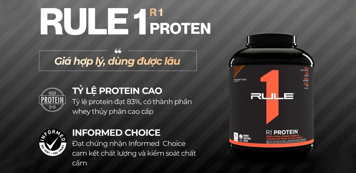 Rule 1 Protein là sản phẩm nổi tiếng từ thương hiệu Rule One Proteins (Mỹ). Sản phẩm chứa 100% whey isolate và hydrolyzed, giúp hấp thu cực nhanh, lý tưởng để dùng ngay sau khi tập. Với công thức gần như 0 fat – 0 sugar – 0 lactose, Rule 1 Protein được yêu thích bởi gymer đang siết cơ, giảm mỡ hoặc cần nguồn protein sạch tuyệt đối. Hương vị của R1 cũng được đánh giá là nhẹ, dễ uống, phù hợp với những ai muốn duy trì dùng lâu dài mà không ngán.