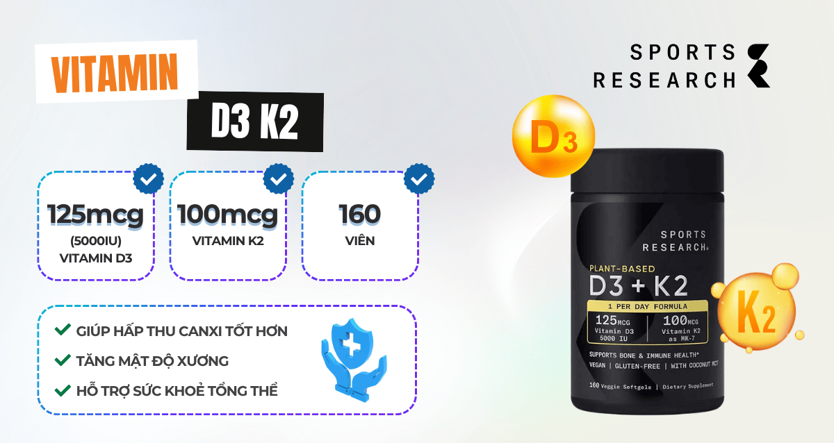 Sports Research Vitamin D3 + K2 là viên uống kết hợp giữa vitamin D3 và K2 phù hợp với gymer, vận động viên, người chơi thể thao,... Viên “2-in-1” này giúp tăng hấp thu canxi và đảm bảo canxi được đưa vào xương thay vì tích tụ ở mạch máu — hỗ trợ tối đa sức khỏe xương, miễn dịch và tim mạch.